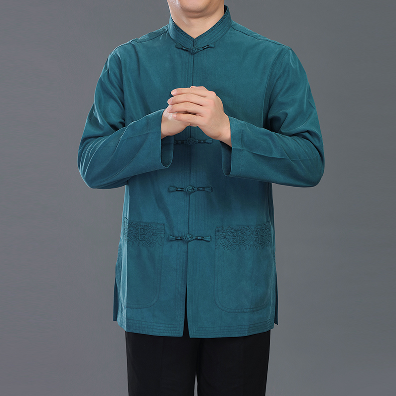中青年唐装男春季中式长袖衬衫中国风立领盘扣休闲青花刺绣上衣