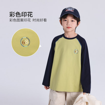 布丁哈鲁春装男童潮流T恤2025春季新款儿童百搭撞色圆领长袖T恤