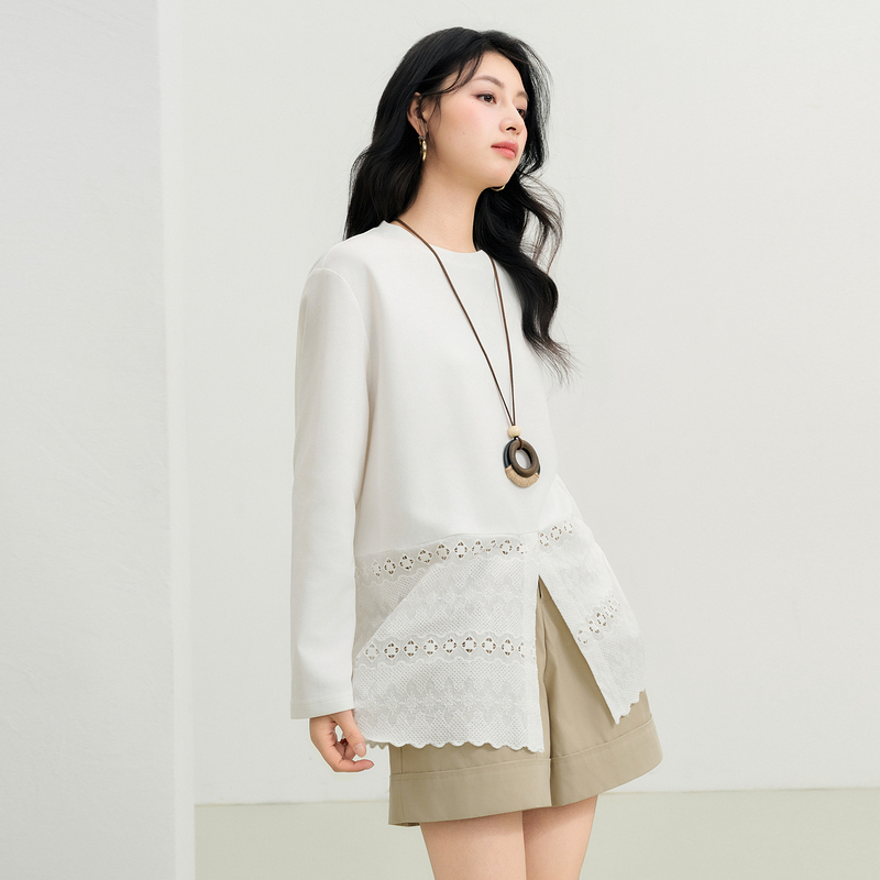 Basic House/百家好蕾丝拼接长袖T恤女秋季新款流行圆领开叉上衣