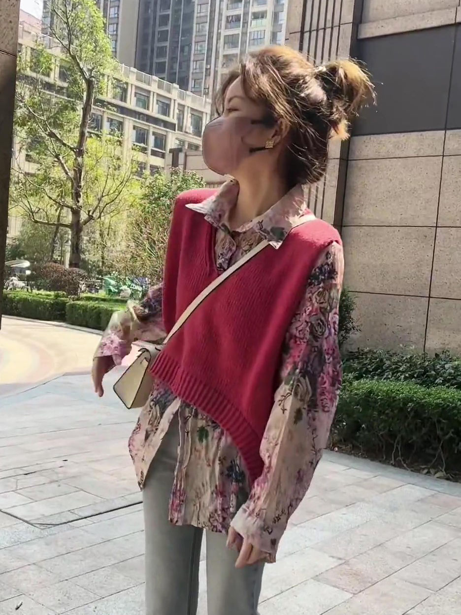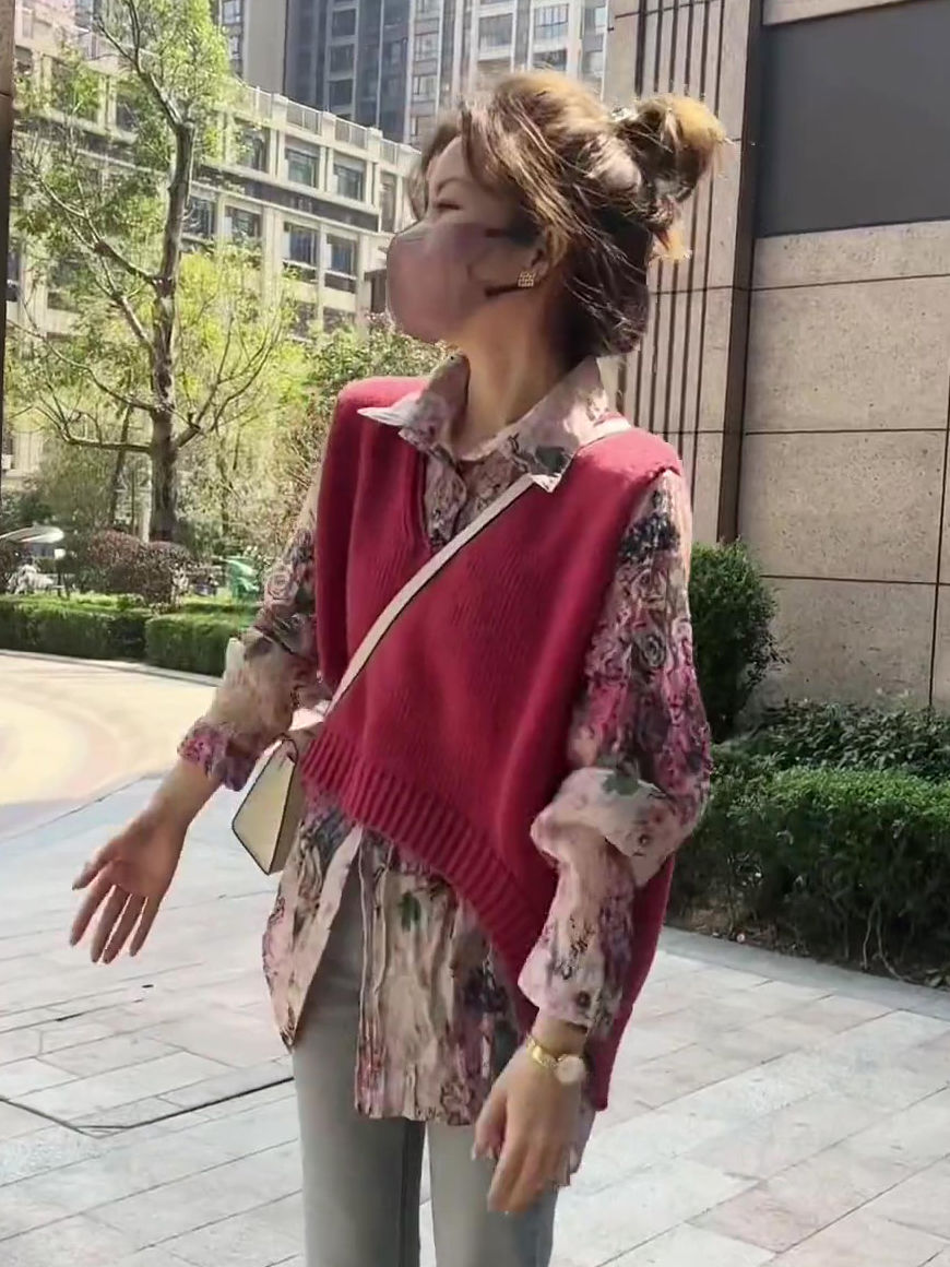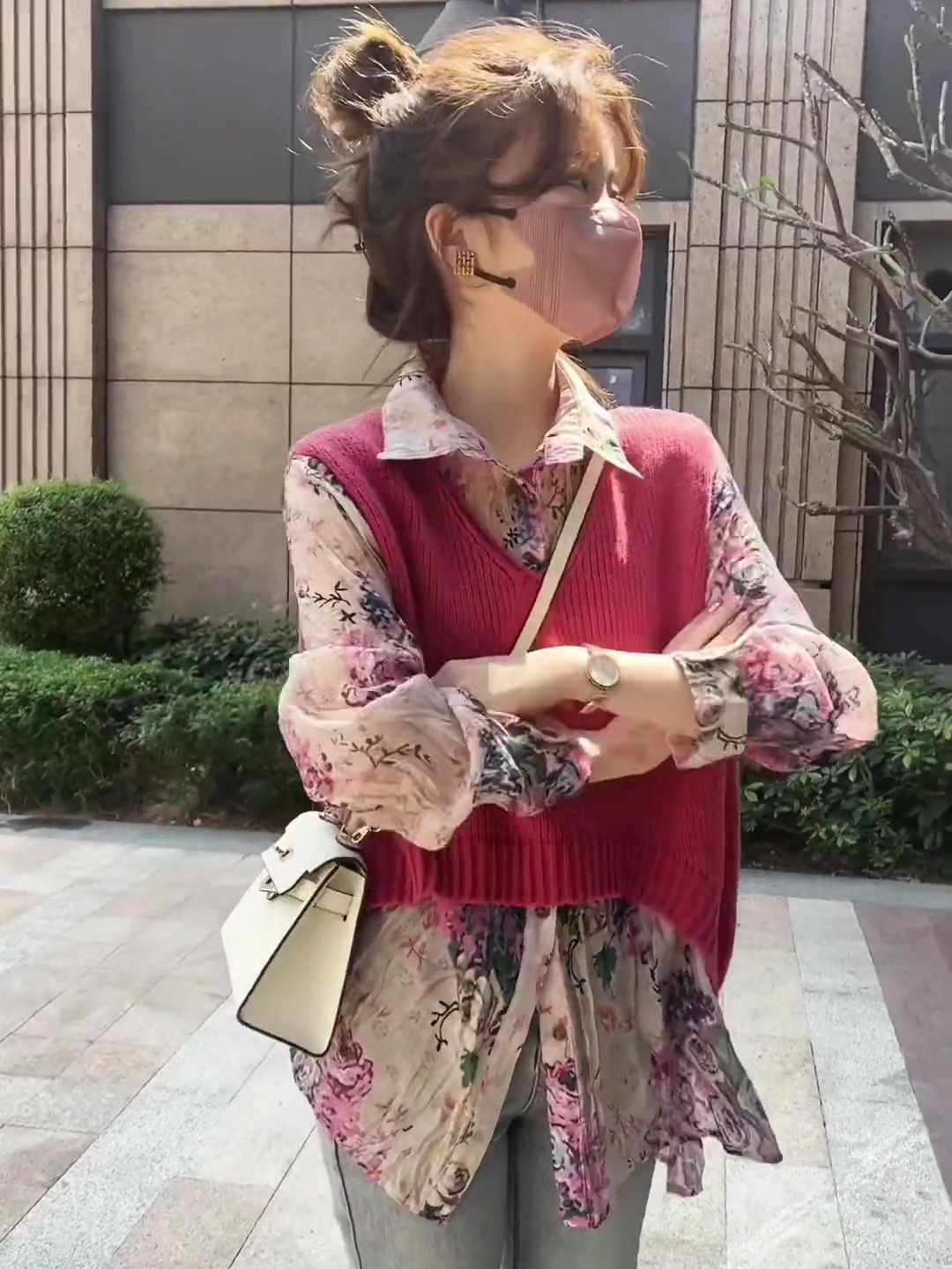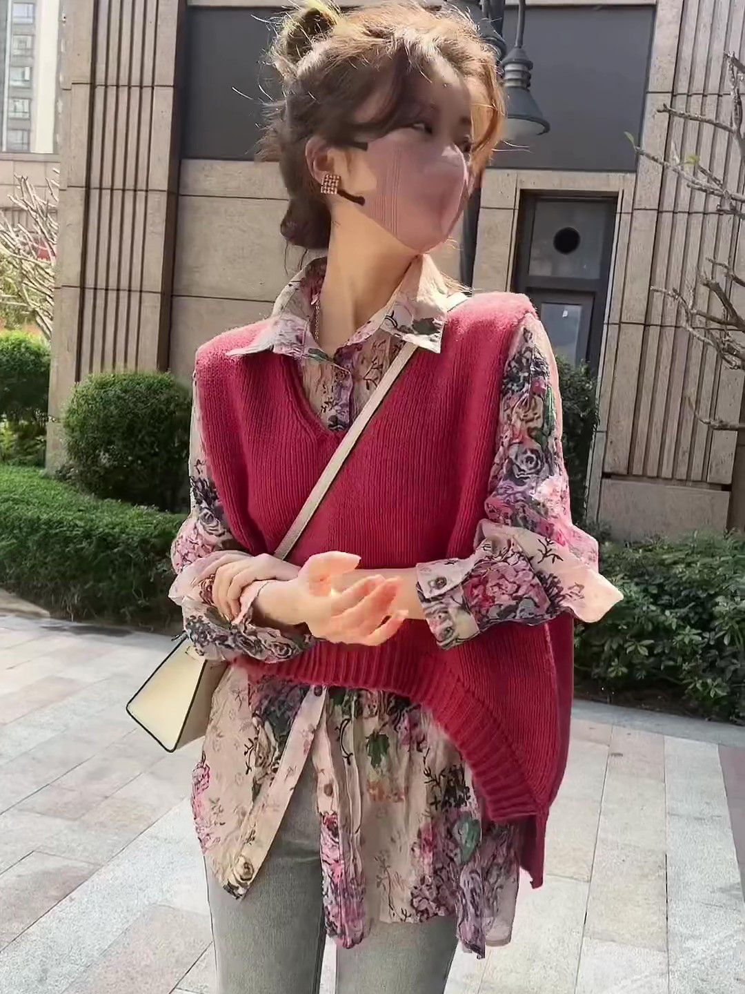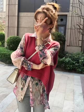 春季新款高级感宽松碎花衬衫遮肉斜边针织马甲今年流行的时尚套装