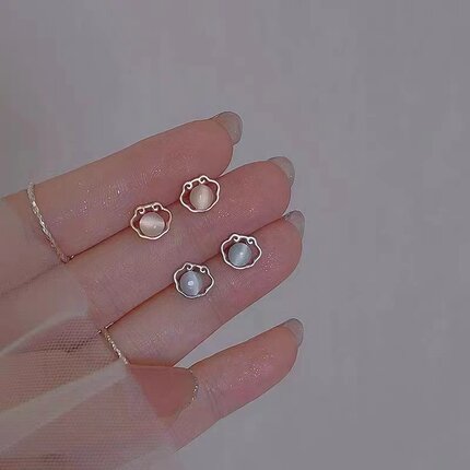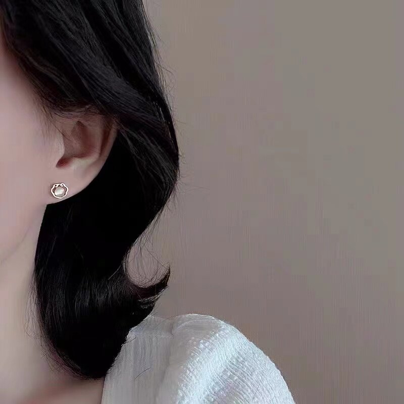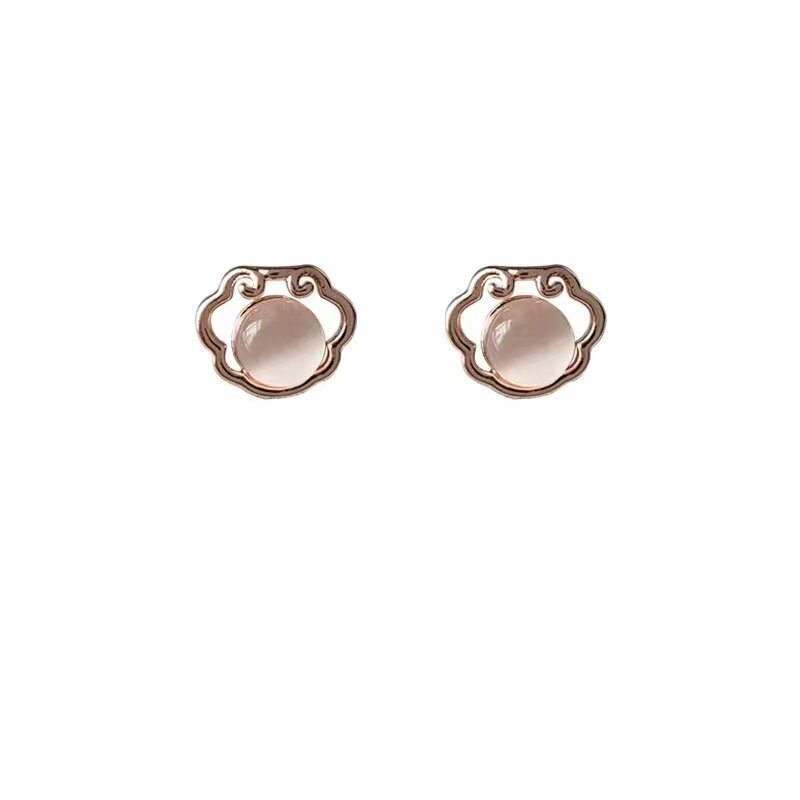 S925银如意长命锁耳钉女复古简约个性猫眼石耳环新款气质耳饰品
