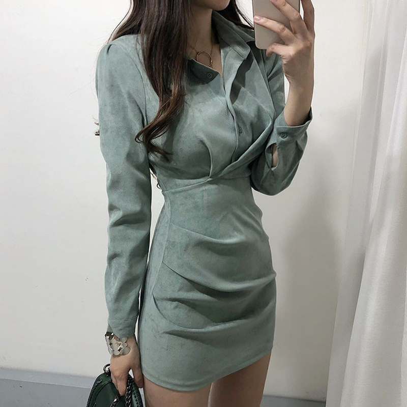 韩国chic气质优雅翻领包臂连衣裙