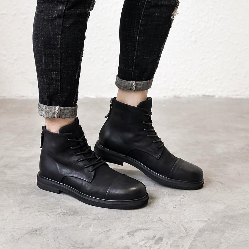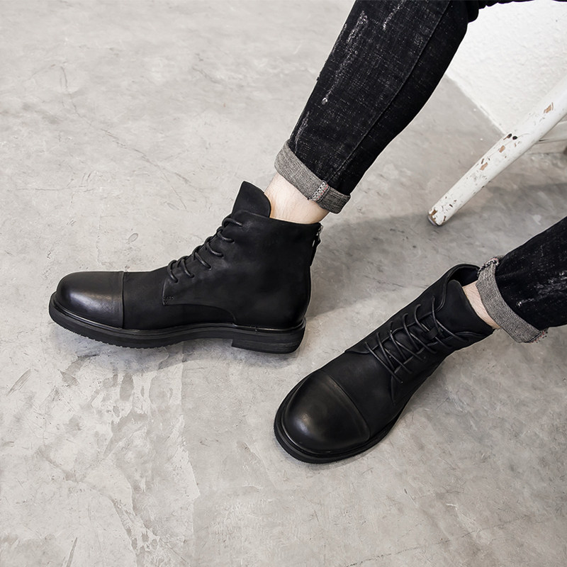 男士皮靴圆头耐磨真皮休闲鞋百搭韩版复古潮流中高帮加绒马丁靴子