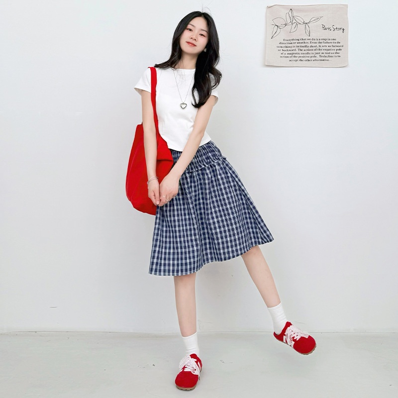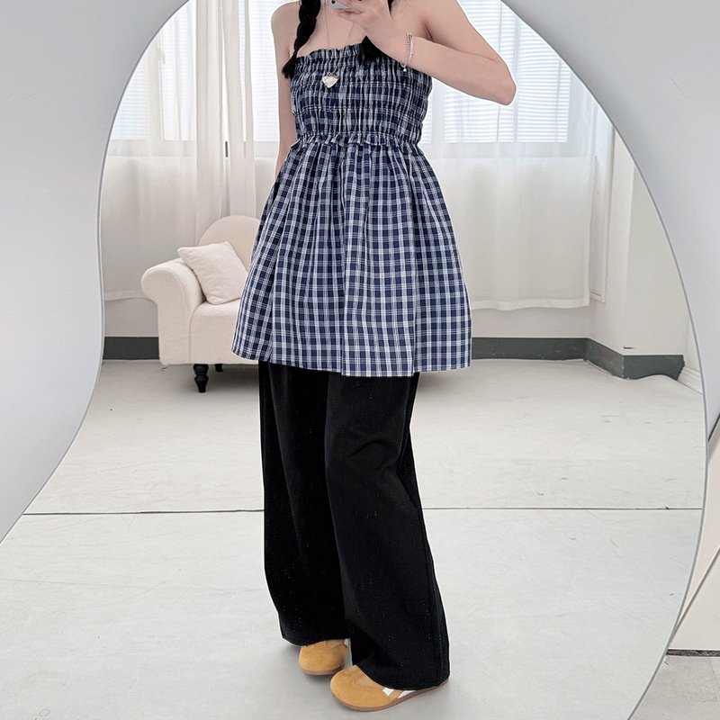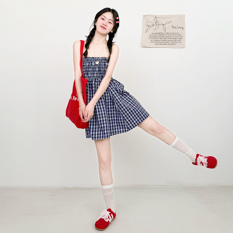 日系两穿半身伞裙夏季新款a字垂感格子裙宽松抹胸裙子女士连衣裙