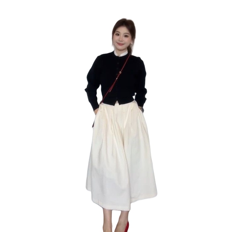 秋季法式气质度假风黑色针织毛衣开衫搭配松紧高腰半身裙两件套装