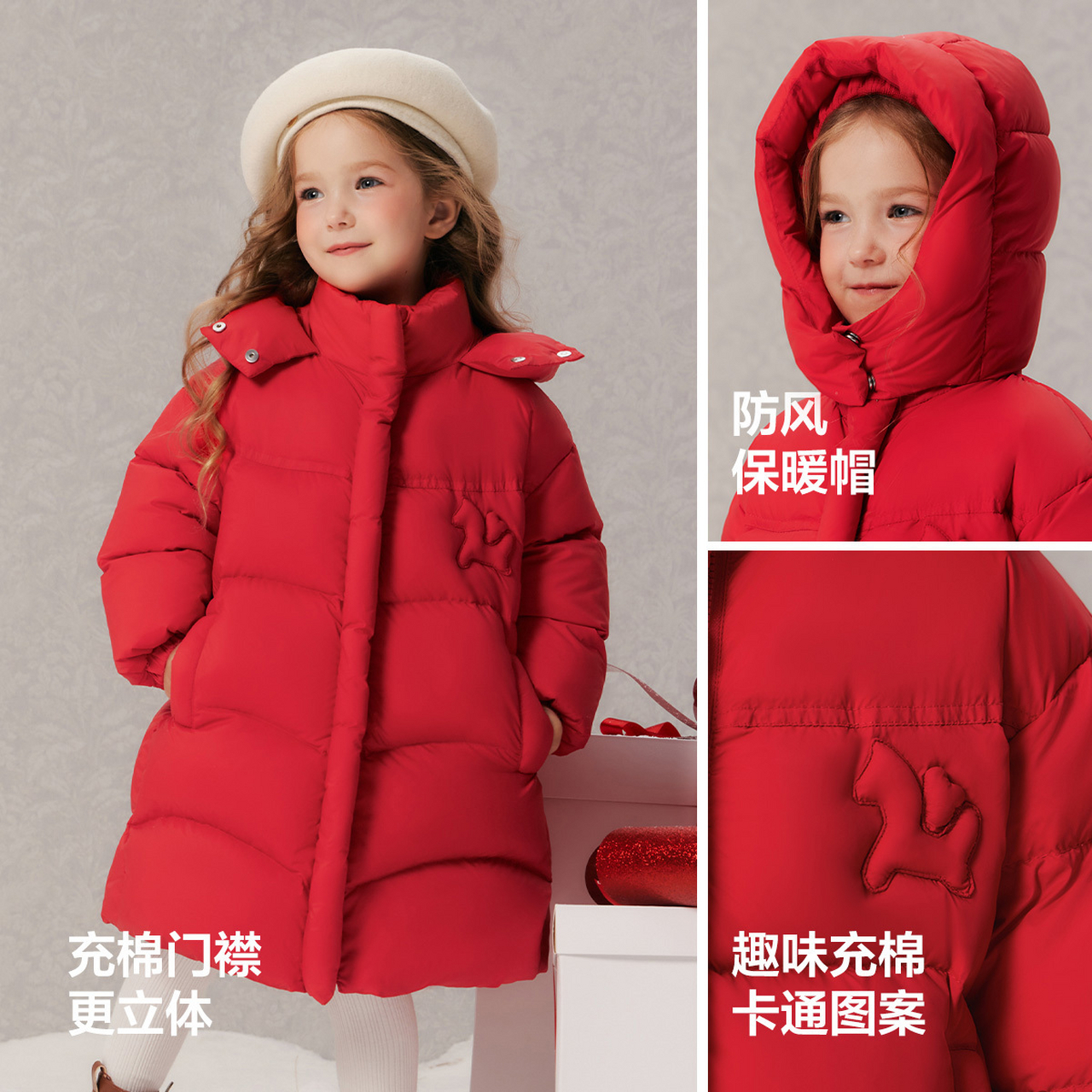 笛莎童装女童羽绒服冬季新款儿童女孩宝宝加厚中长款外套红色新年