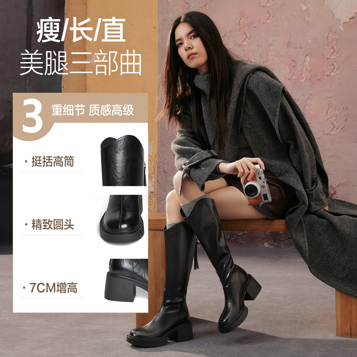 百思图2025冬季新款骑士靴时尚街头潮流通勤粗跟女长靴F3021DG5