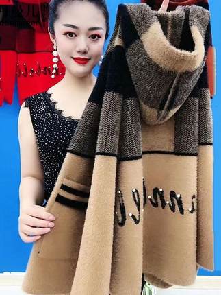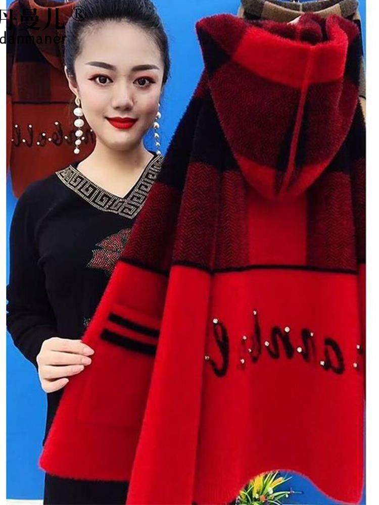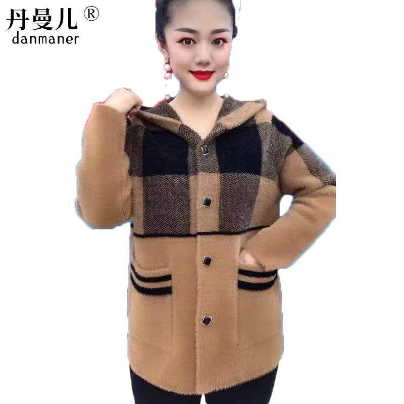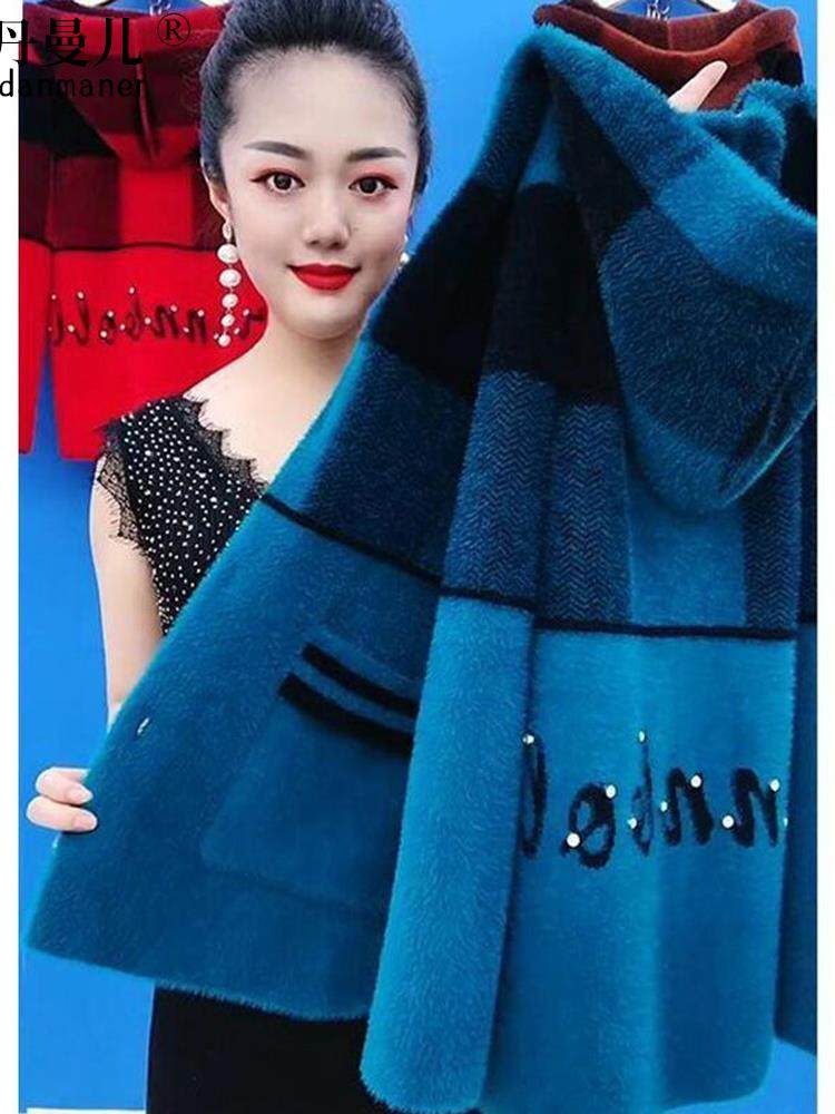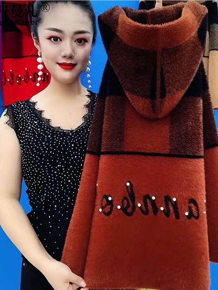 水貂绒毛衣外套妈妈装女秋冬季中老年人针织开衫连帽宽松短款上衣