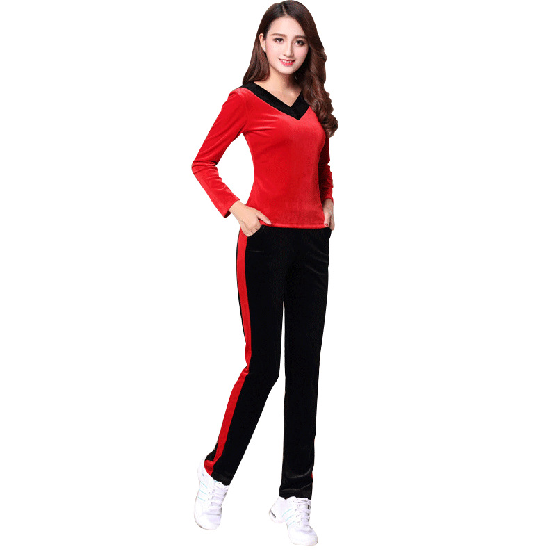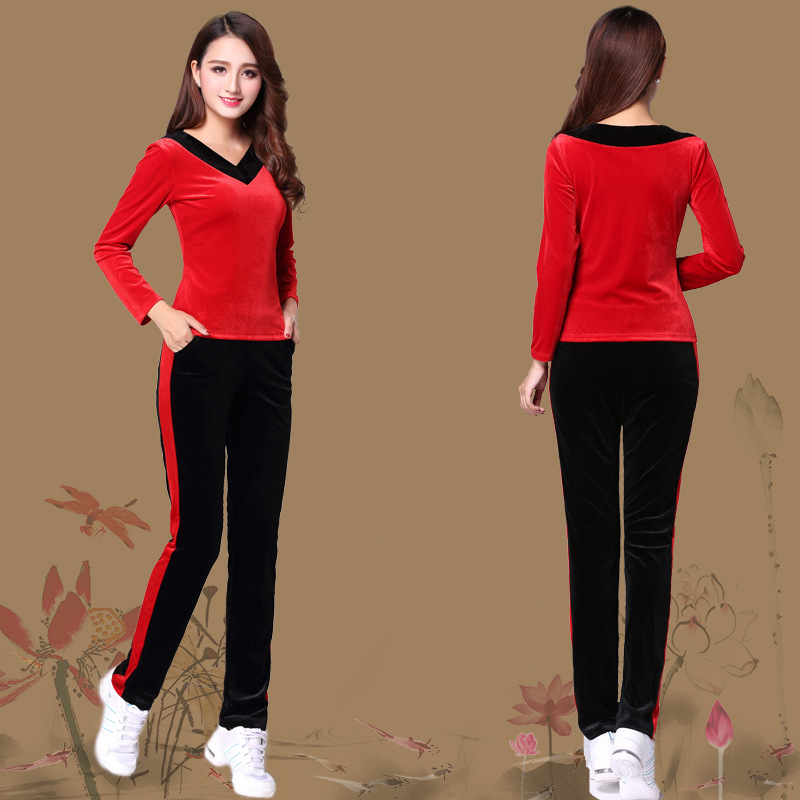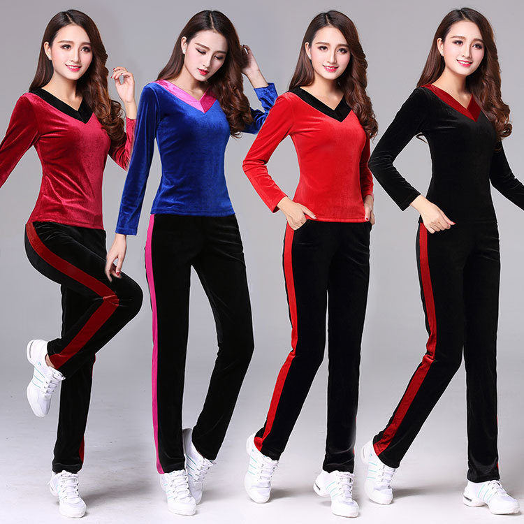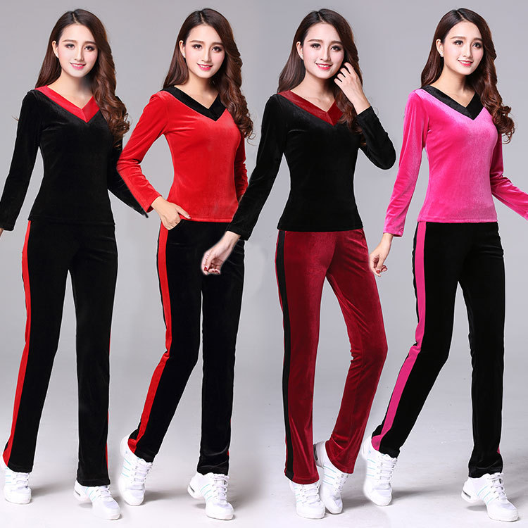 秋冬新款广场舞服装套装加厚金丝绒中老年V领运动舞蹈服跳舞服装