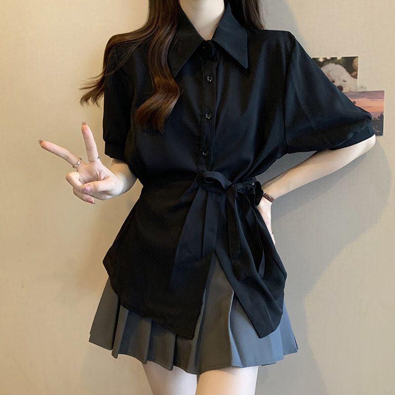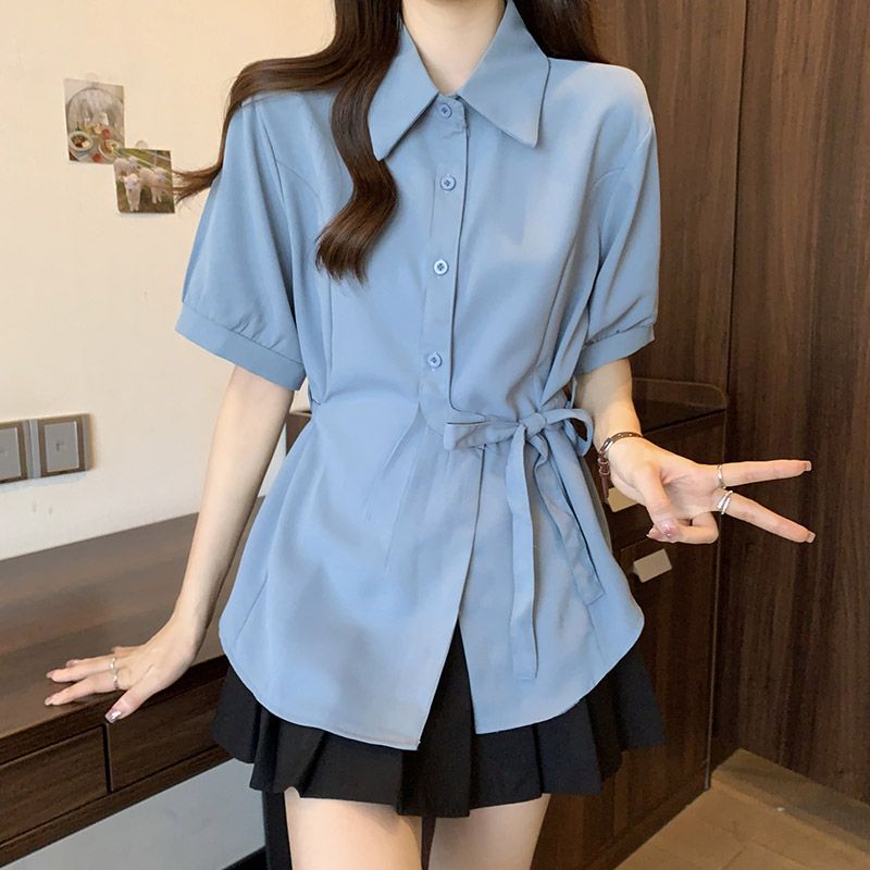 2025夏季法式中长款收腰雪纺短袖衬衫胖mm显瘦遮肚藏肉上衣半袖