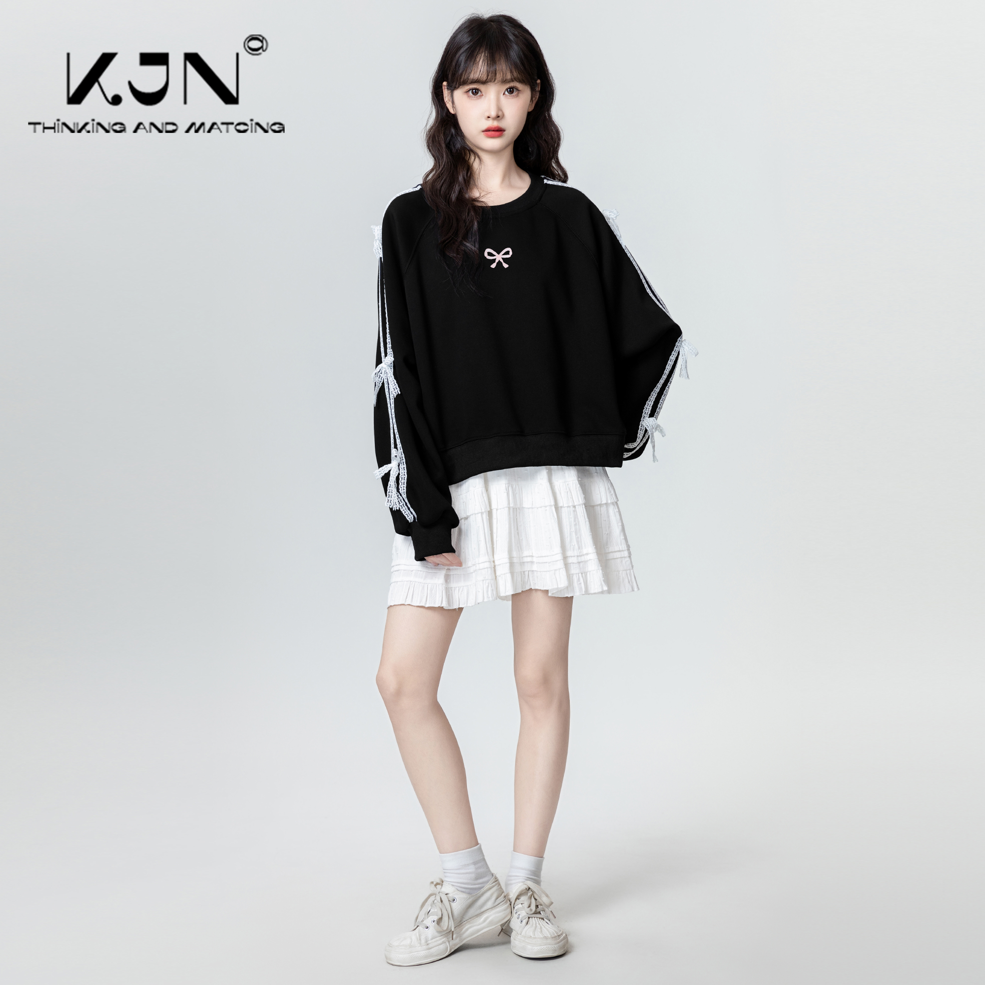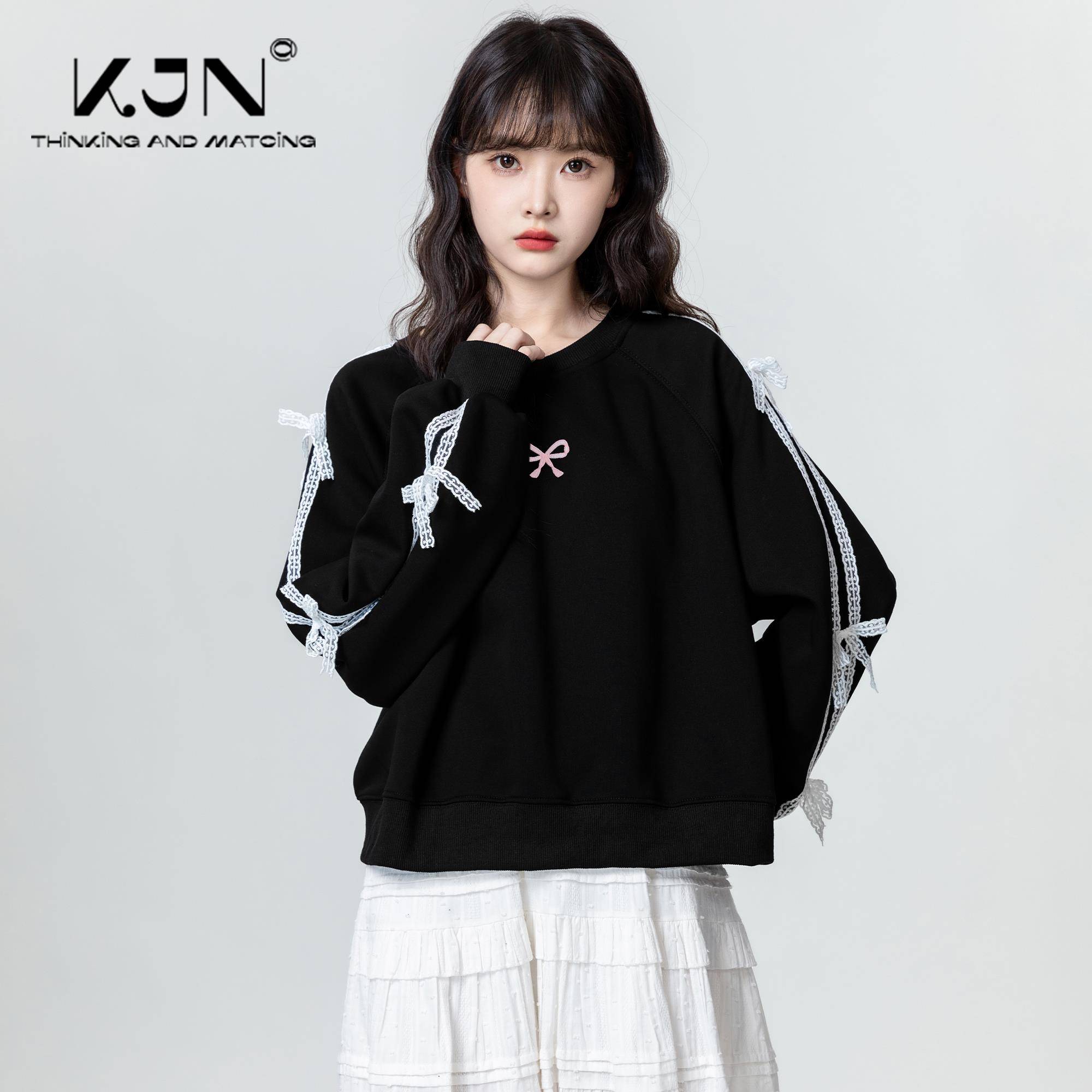 蕾丝拼接蝴蝶结黑色卫衣女2025春秋新款设计感宽松圆领上衣外套潮