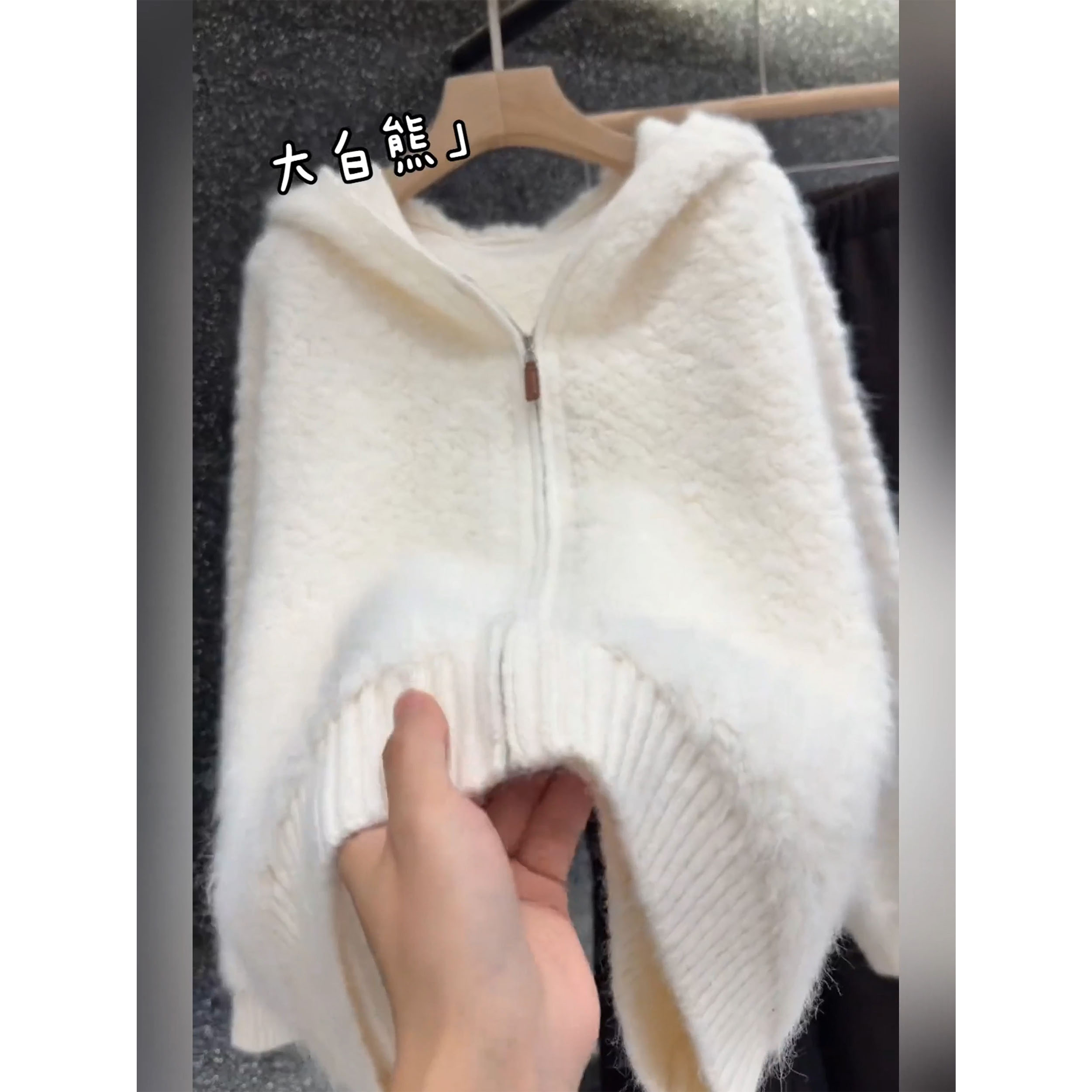 秋冬轻熟简约风连帽拉链羊毛衫女白色宽松慵懒风毛绒针织开衫外套