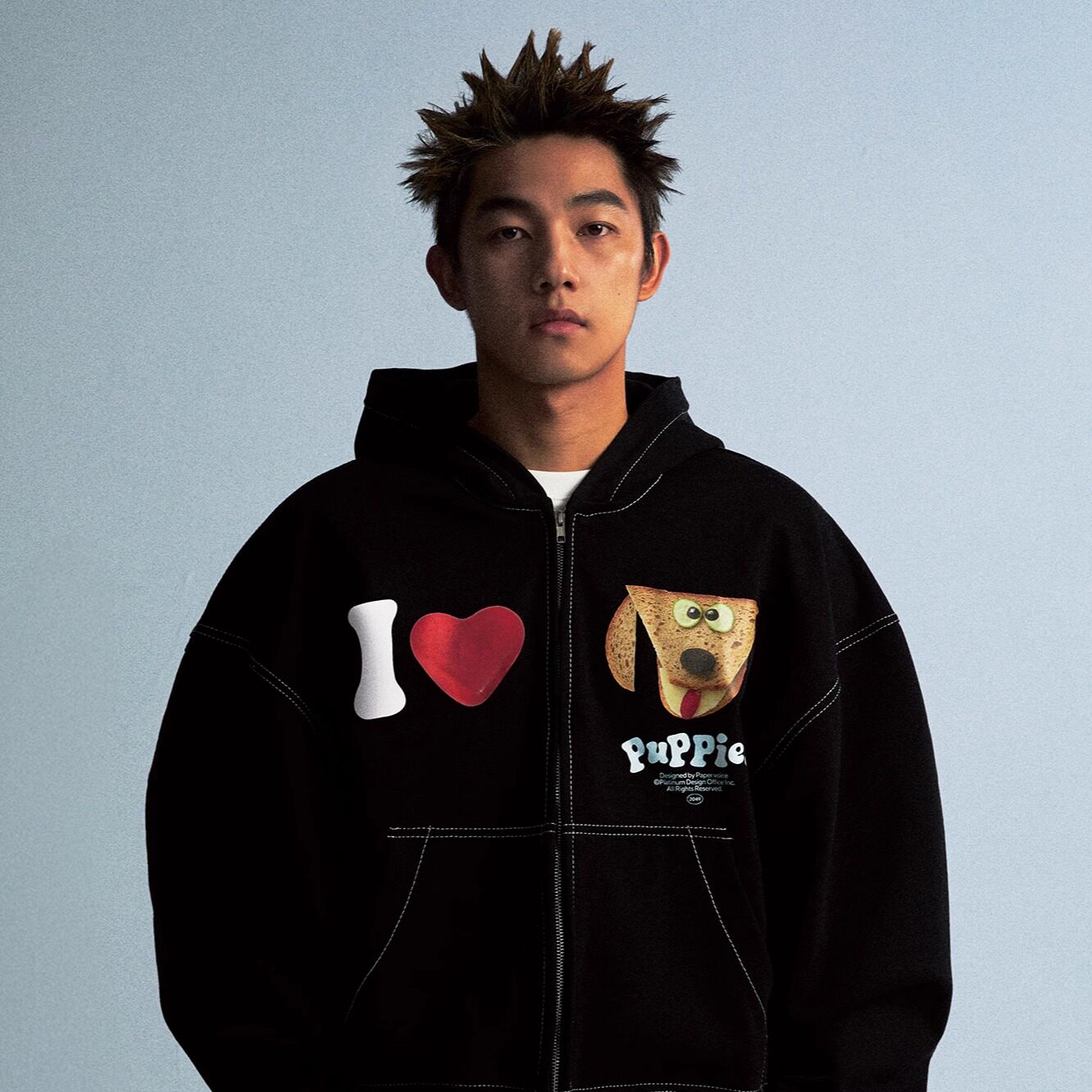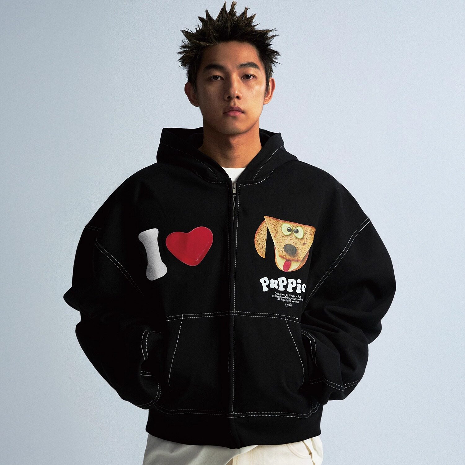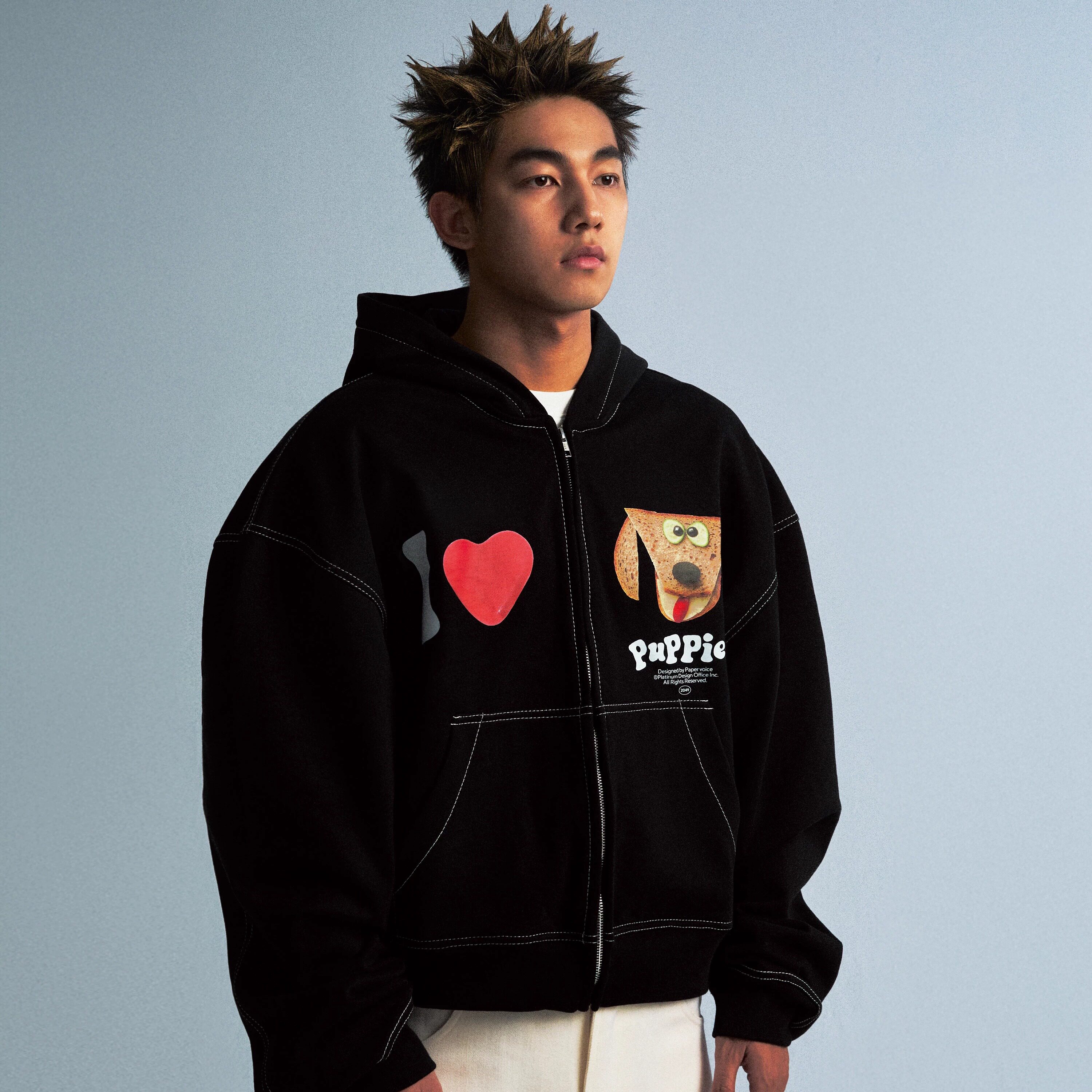 Paper voice面包小狗黑色连帽卫衣美式休闲复古明线重磅收腰短款