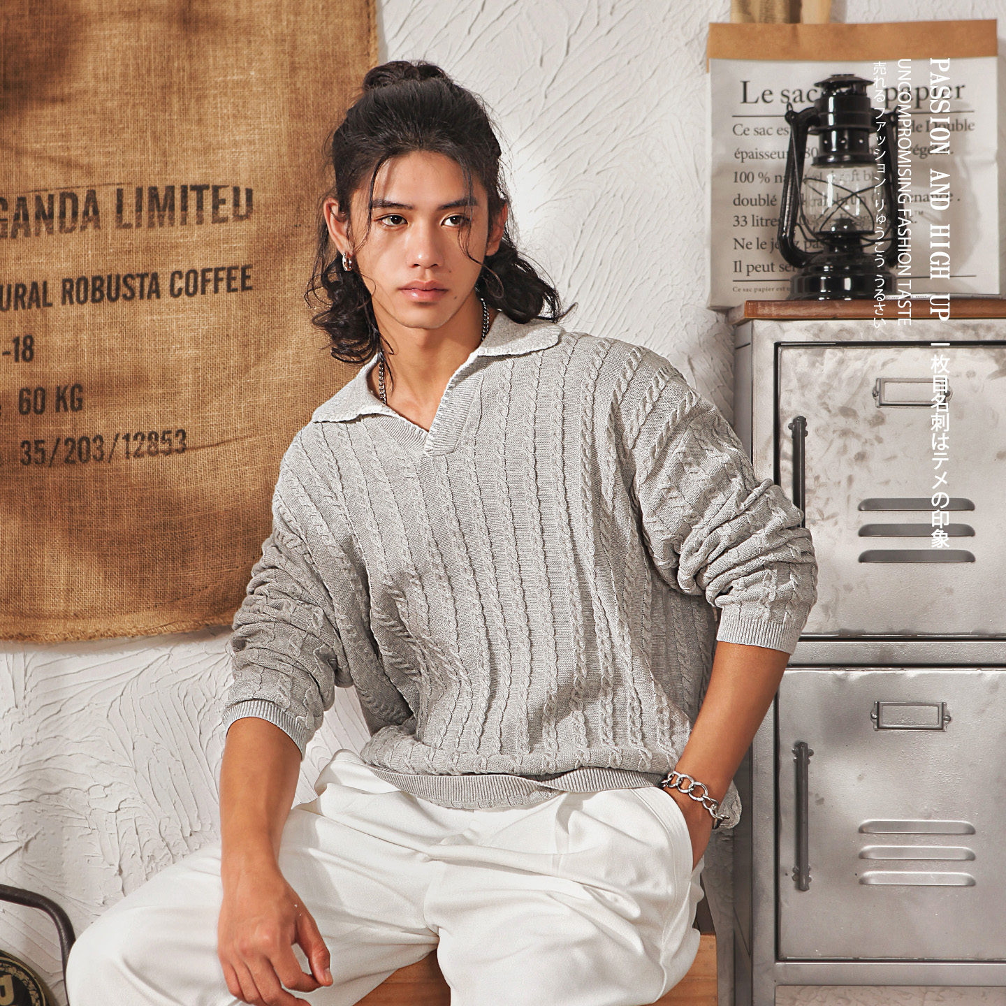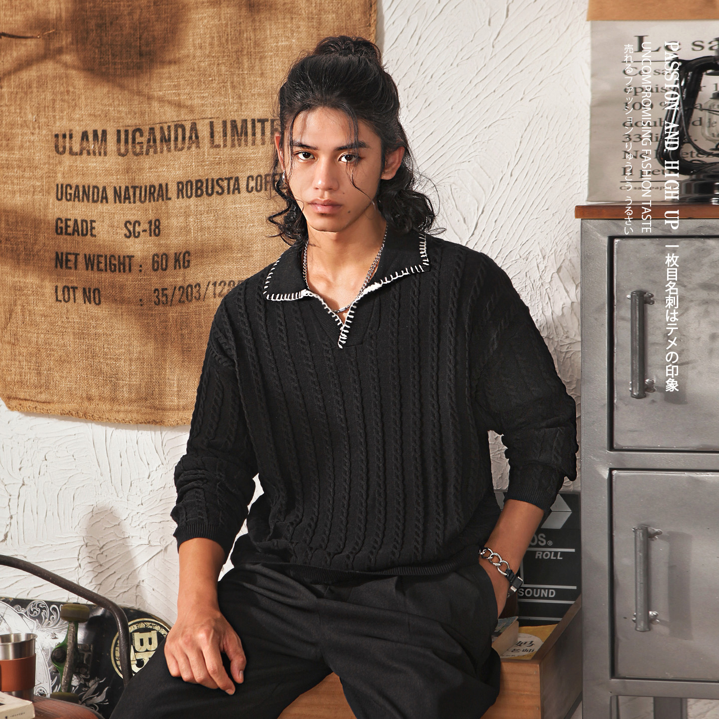 日系复古高级感翻领老钱风毛衣男秋季潮牌辑明线针织衫外套上衣服
