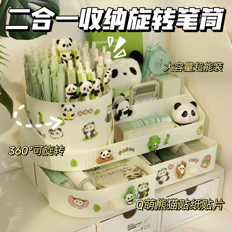 熊猫收纳盒一体抽屉式旋转笔筒超大容量儿童女孩小学生桌面书桌笔桶可爱多功能笔盒360度置物架神器男孩女童