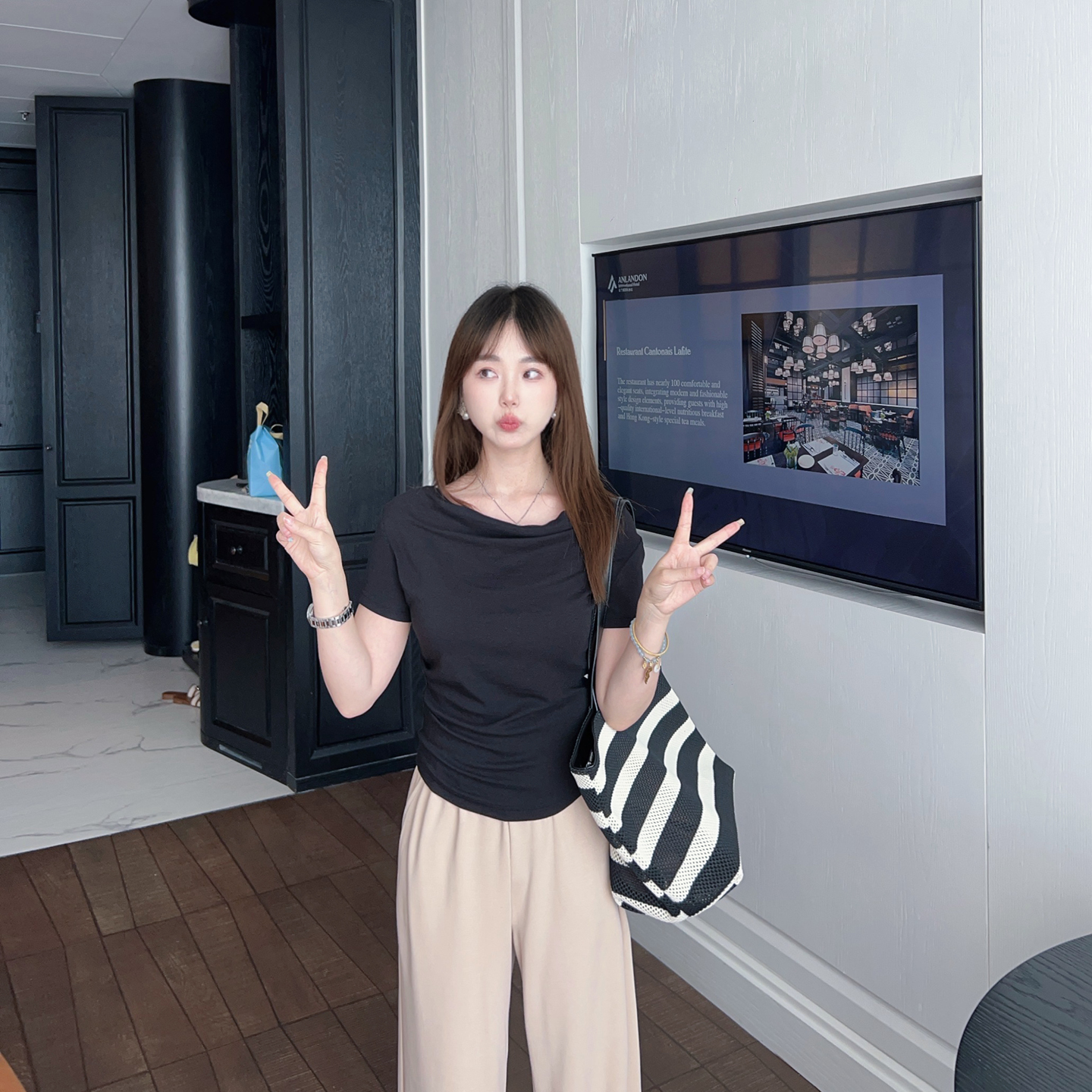 小小家 小个子小码荡领T恤软糯甜美知性可露肩短袖上衣女150