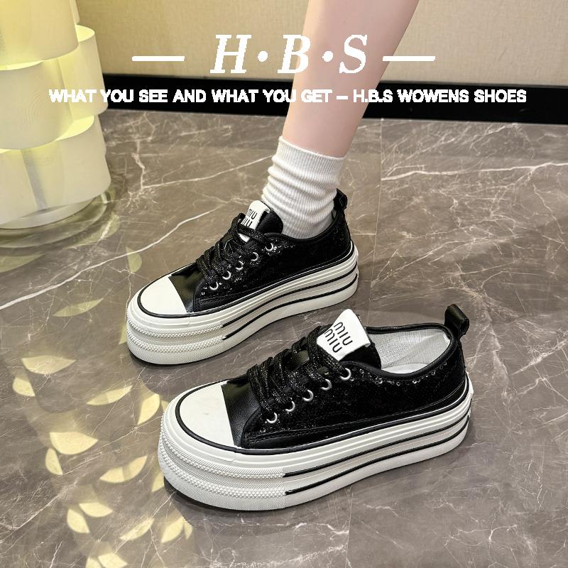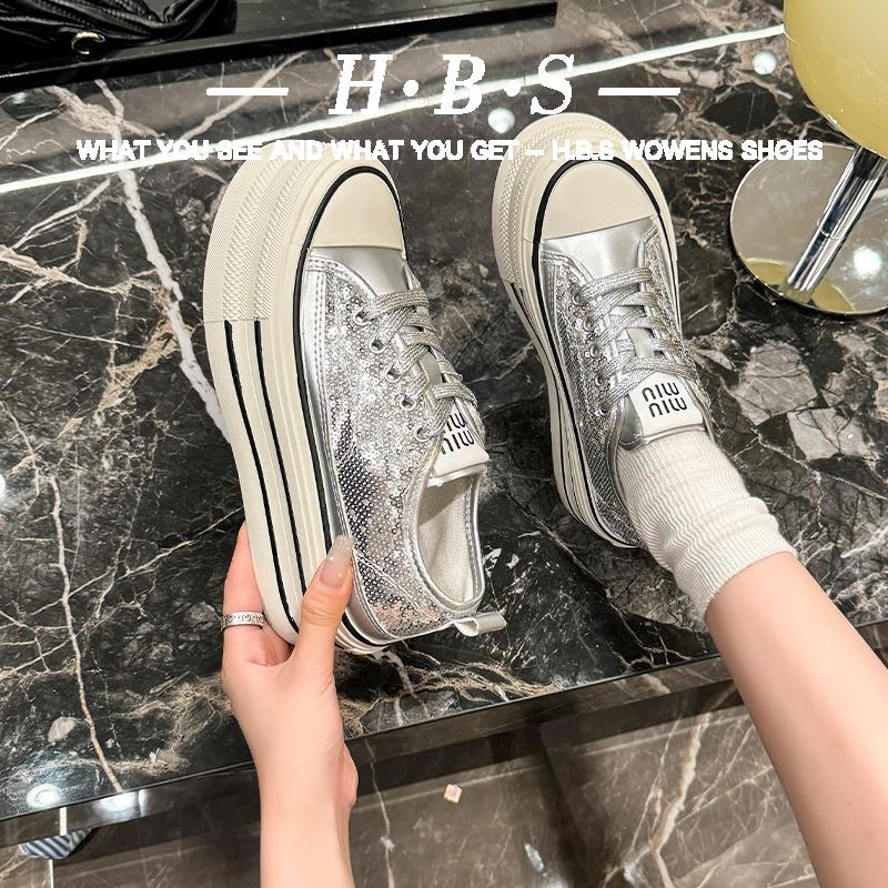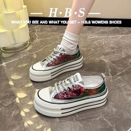 厚底帆布鞋2025年新款春季网面透气女鞋百搭松糕亮片增高休闲板鞋