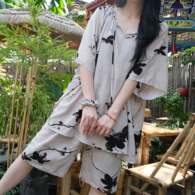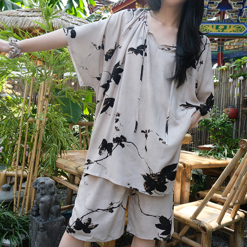 带内衬睡衣女夏季棉绸短袖国风家居服可外穿宽松大码防凸点套装薄