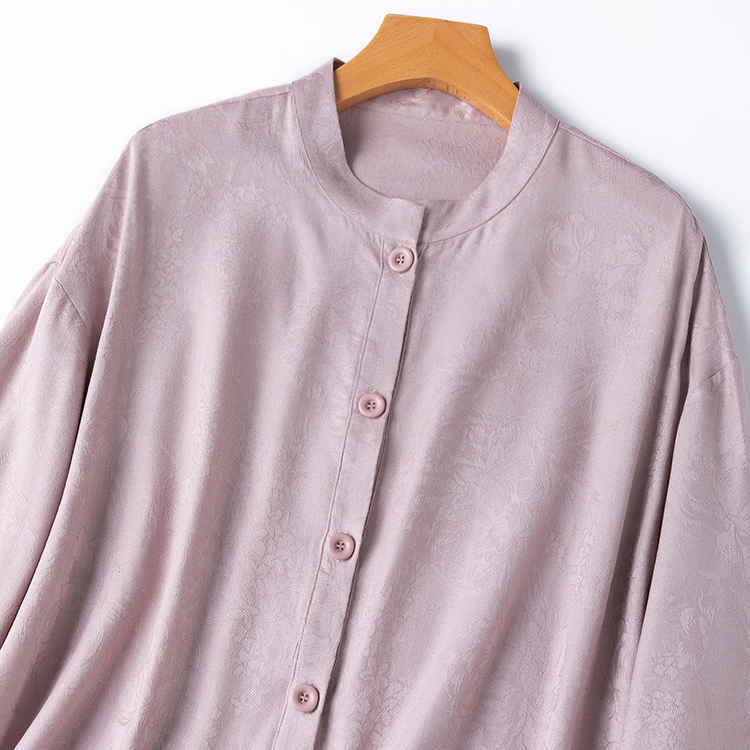 品质高货衬衫裙!真丝提花绢丝灰粉立领落肩袖宽松开衫百搭连衣裙