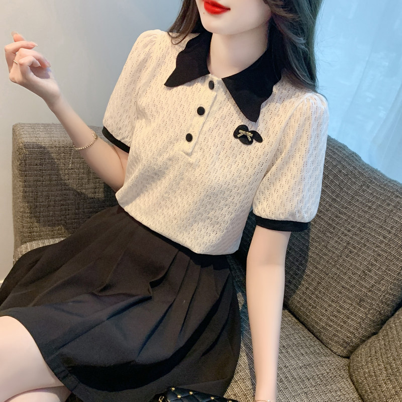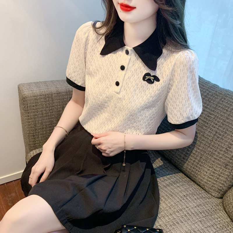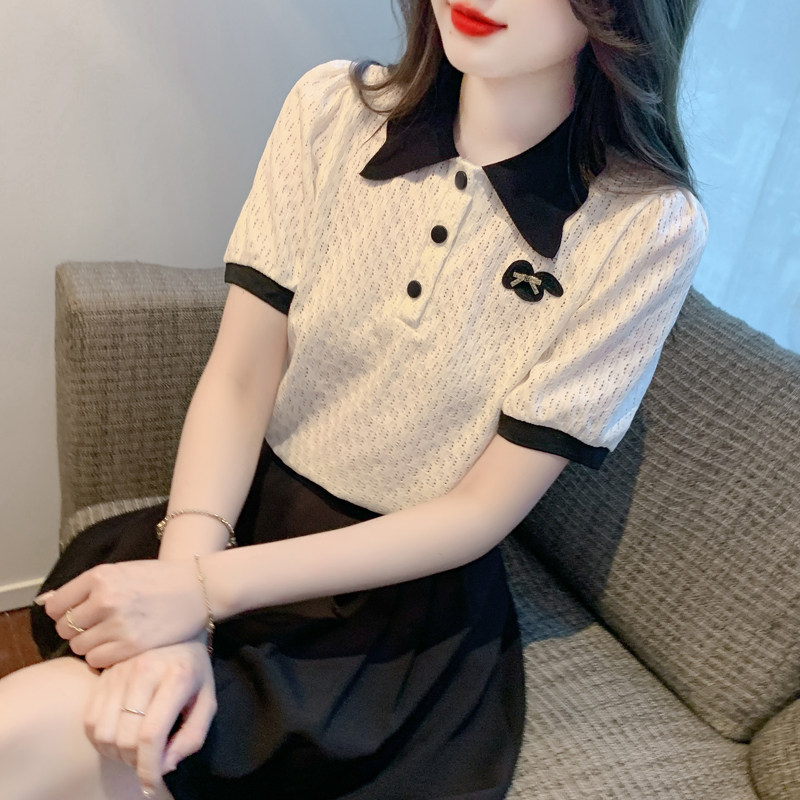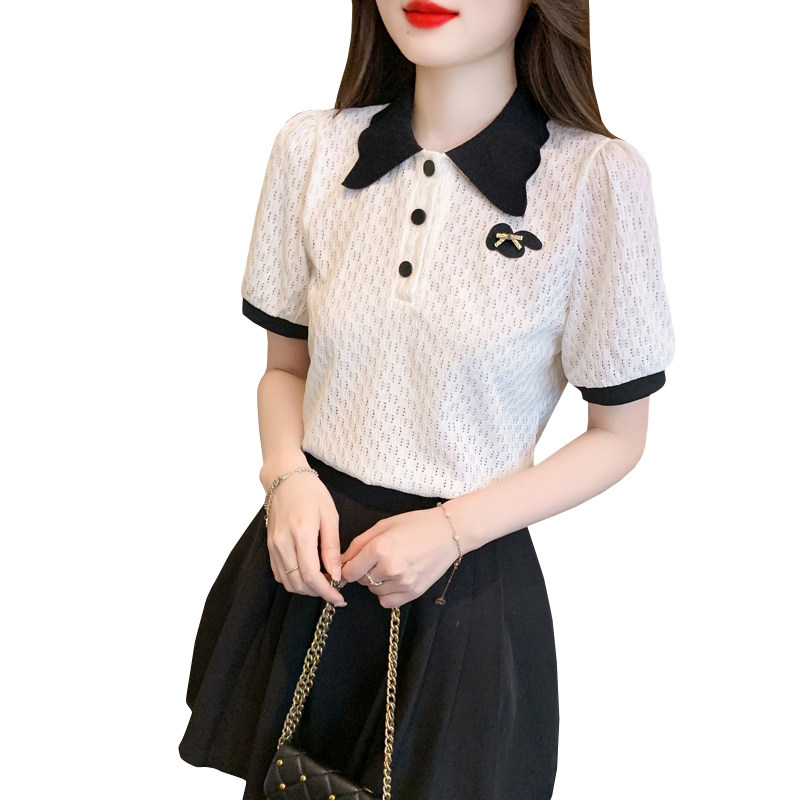 polo领蕾丝体恤2024夏季新款显瘦百搭上衣女士短袖t恤半袖雪纺衫