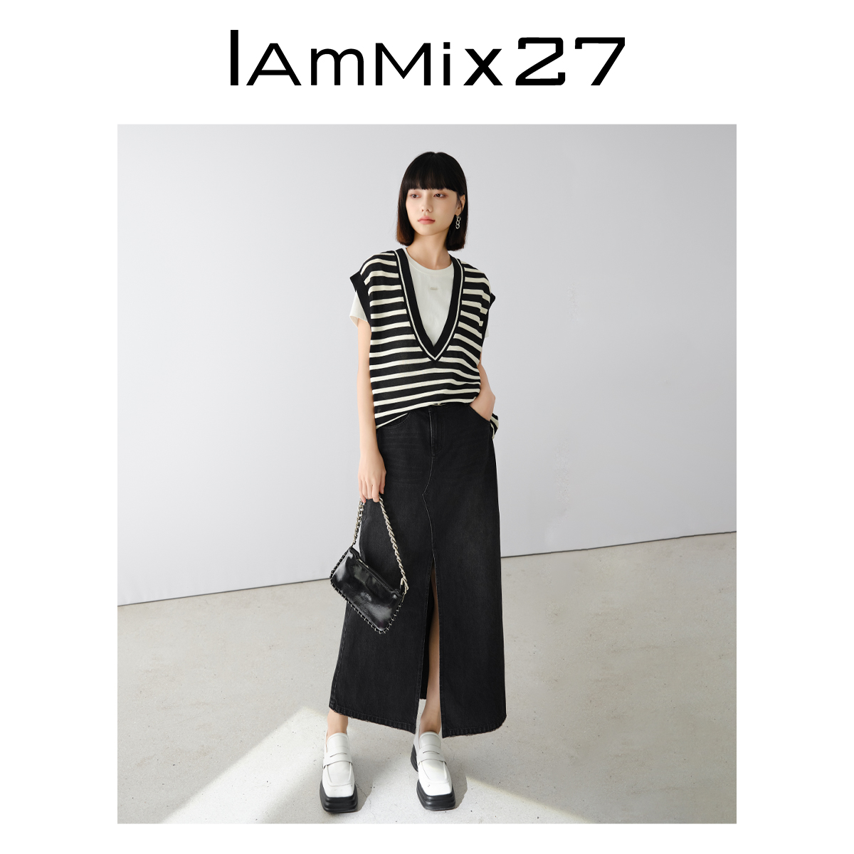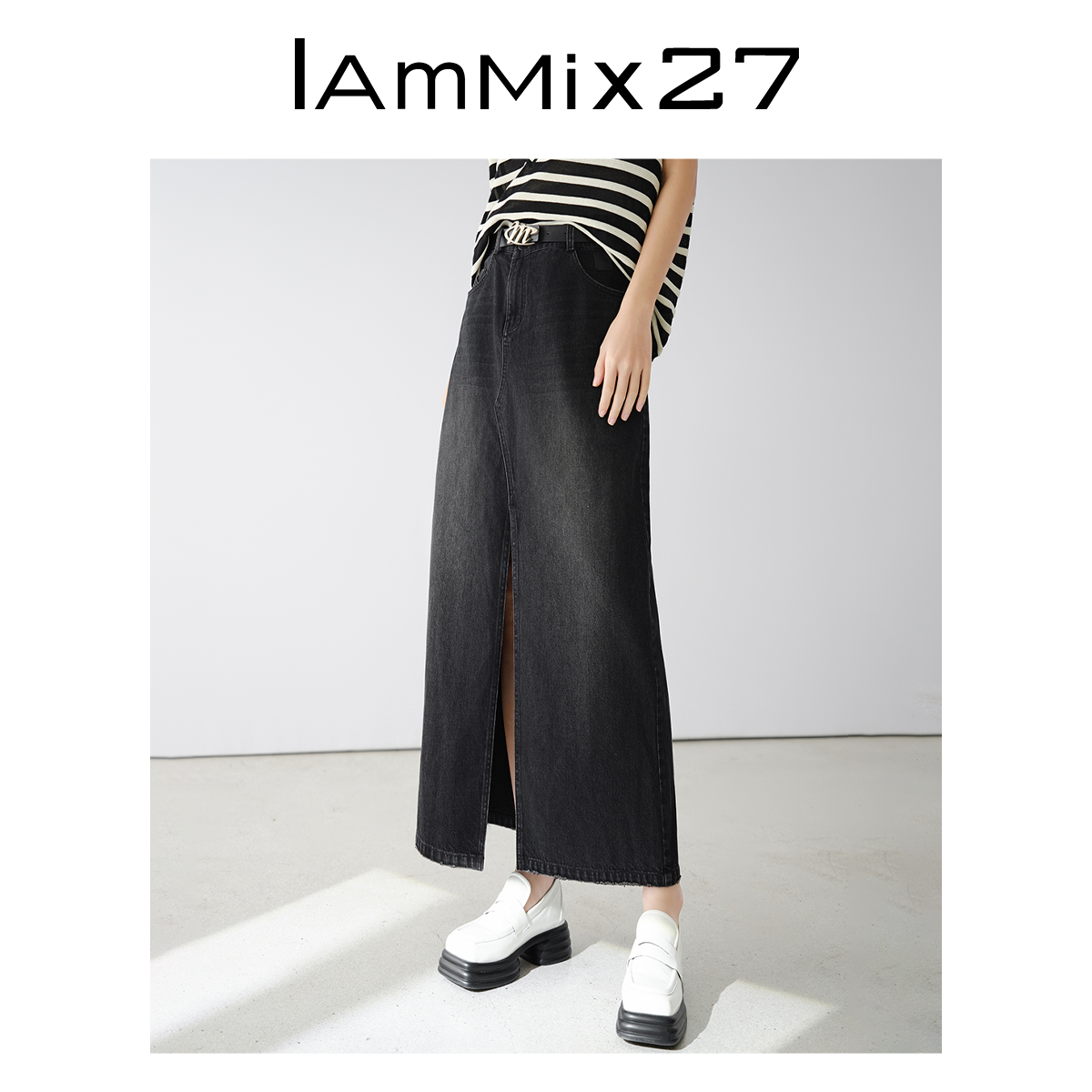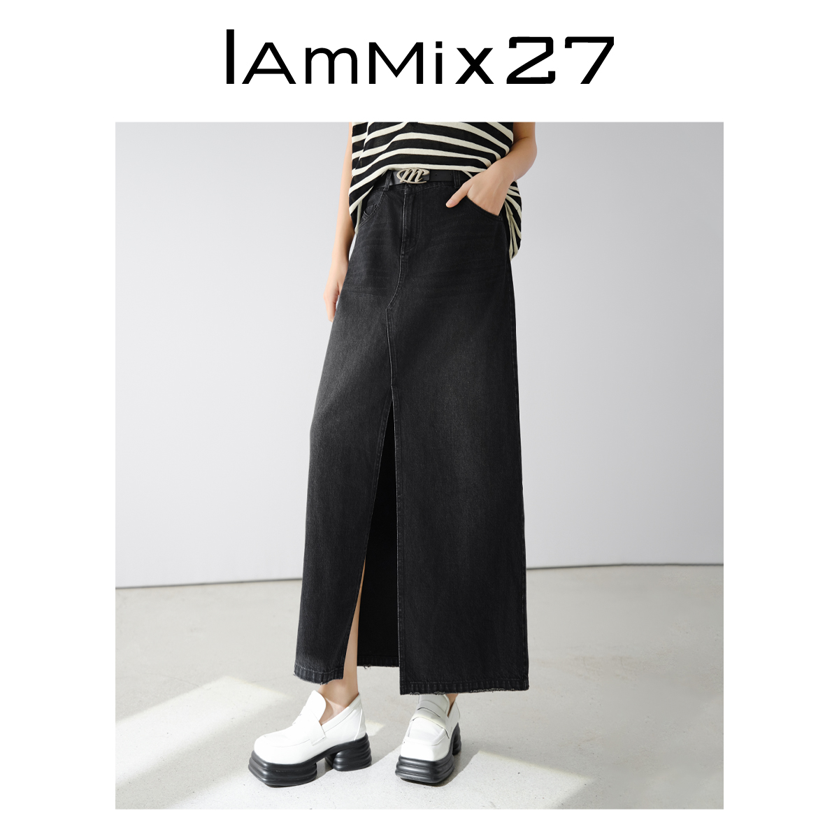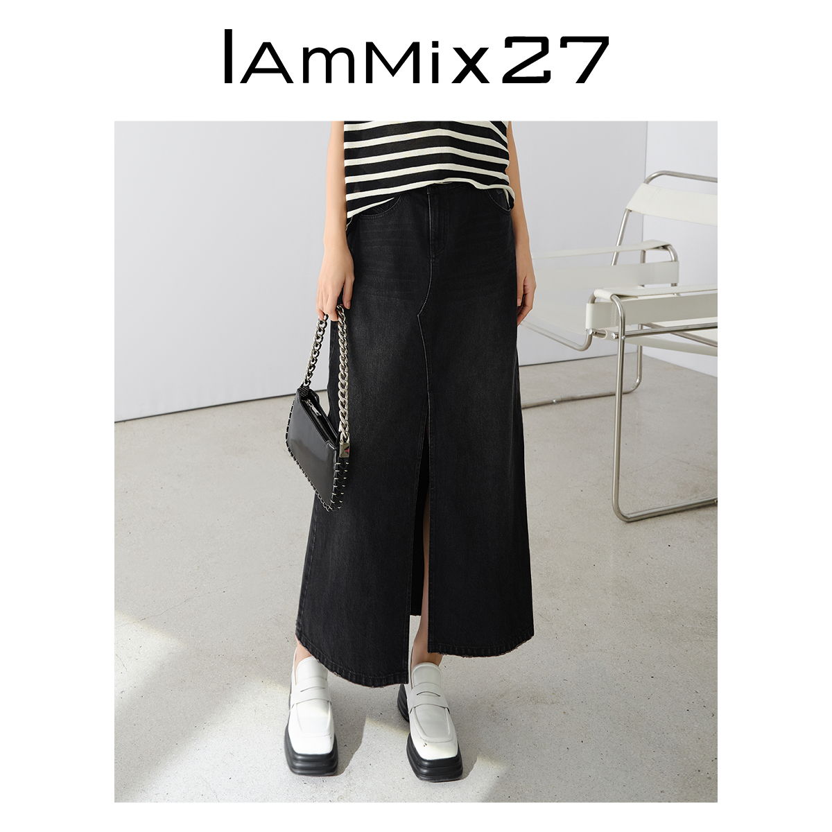 IAmMIX27黑色牛仔裙女高腰修身显瘦百搭过膝开衩全棉半身裙女长裙