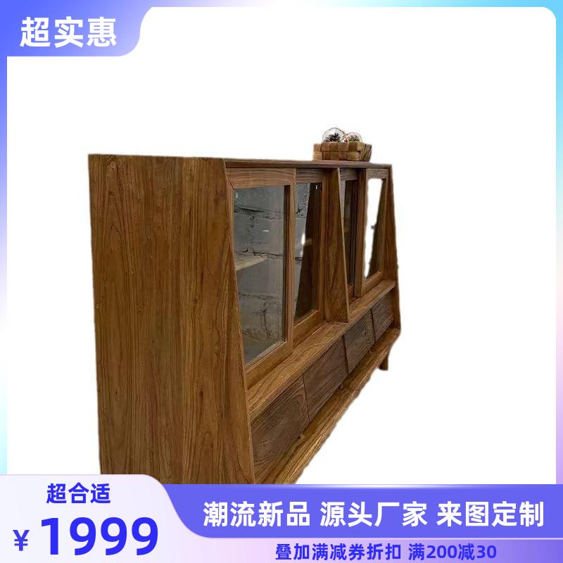 老榆木餐边柜实木收纳柜靠墙茶水柜民宿玻璃储物柜茶具茶杯收藏柜