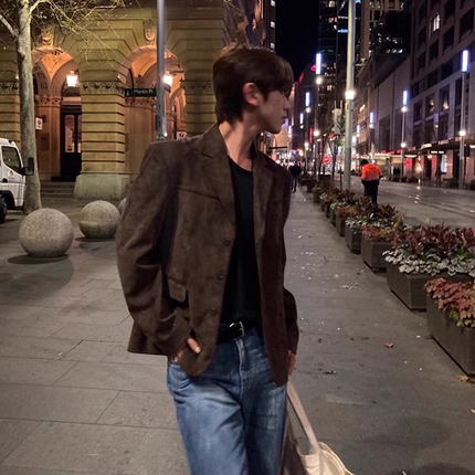 设计高级感麂皮绒西装外套男士春秋款潮牌痞帅休闲单西dk制小西服