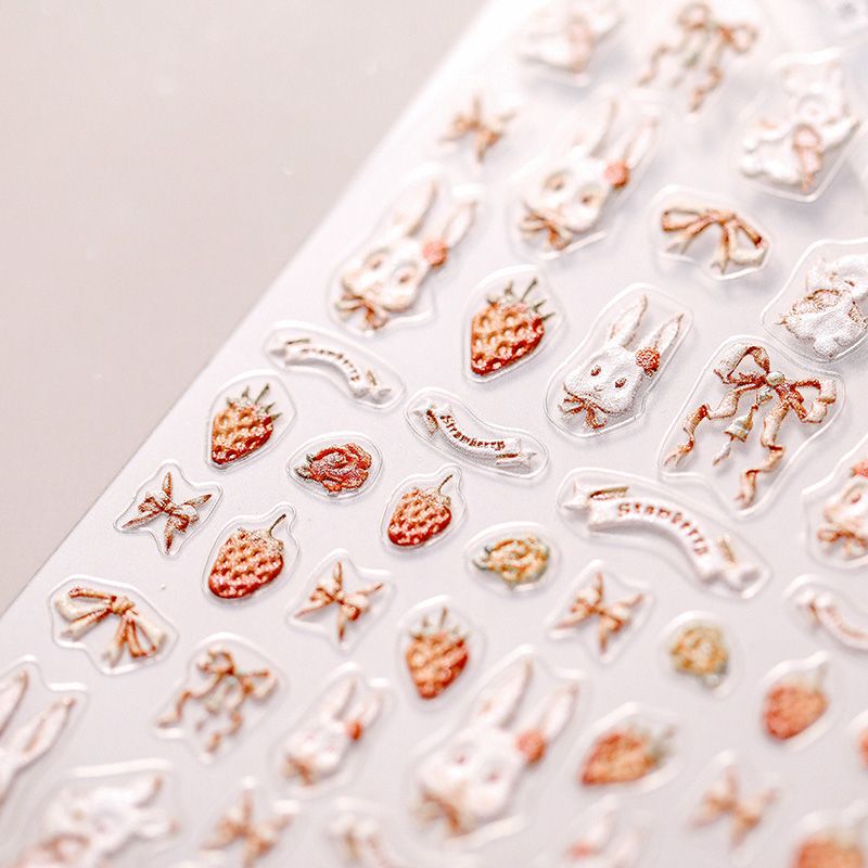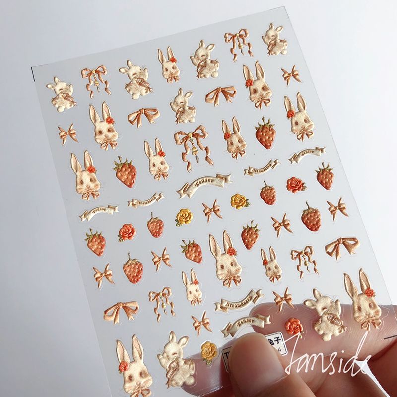 2024复古洛可可浮雕美甲ins草莓小兔可爱贴纸指甲蝴蝶结立体卡通