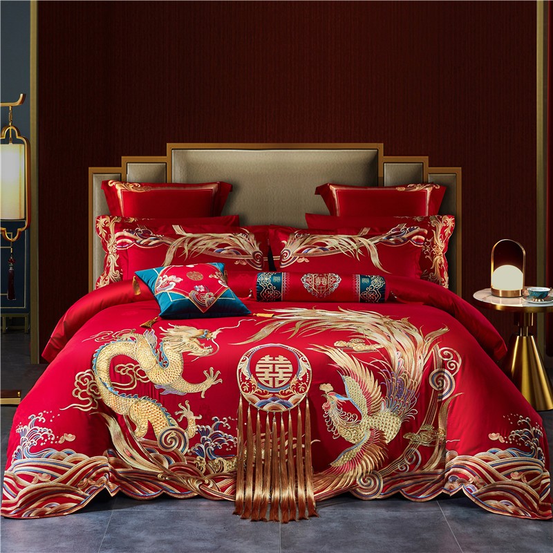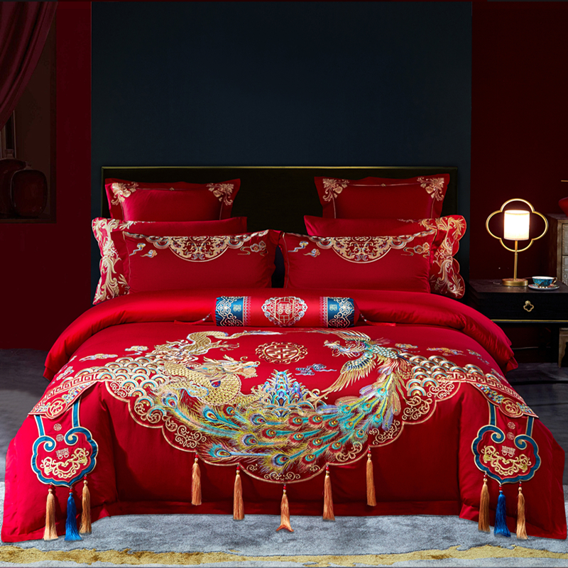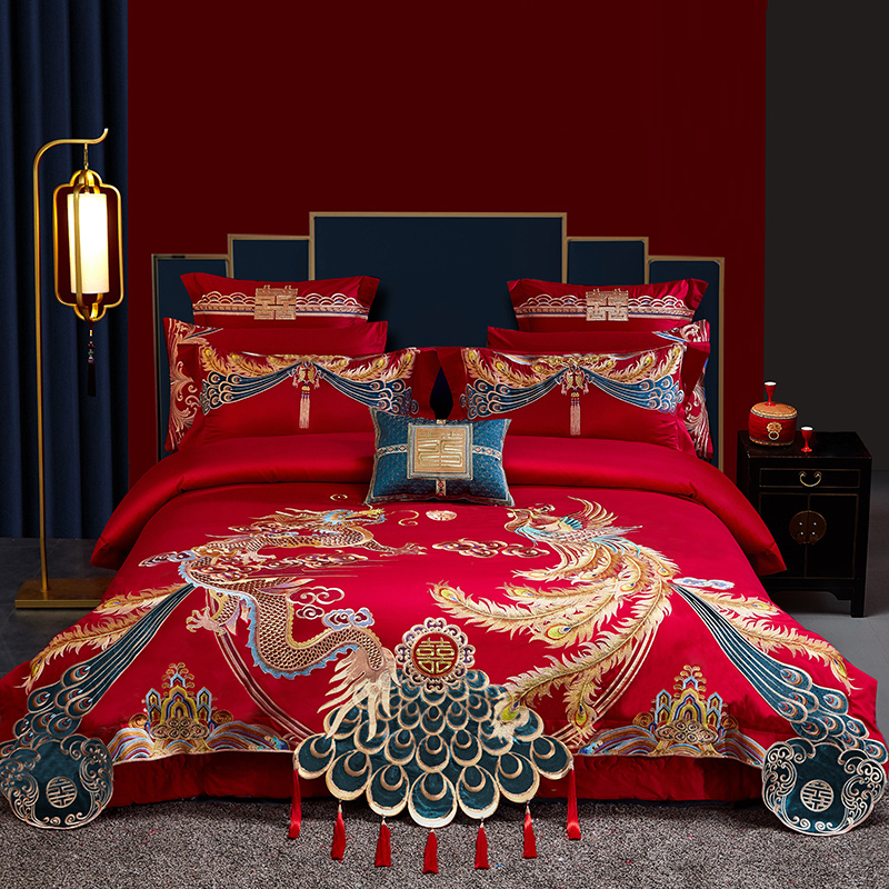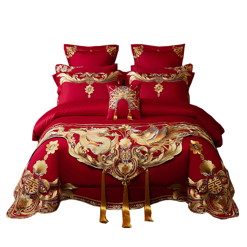 120支高端中式婚庆四件套长绒棉刺绣全棉被套结婚大红色陪嫁床品4