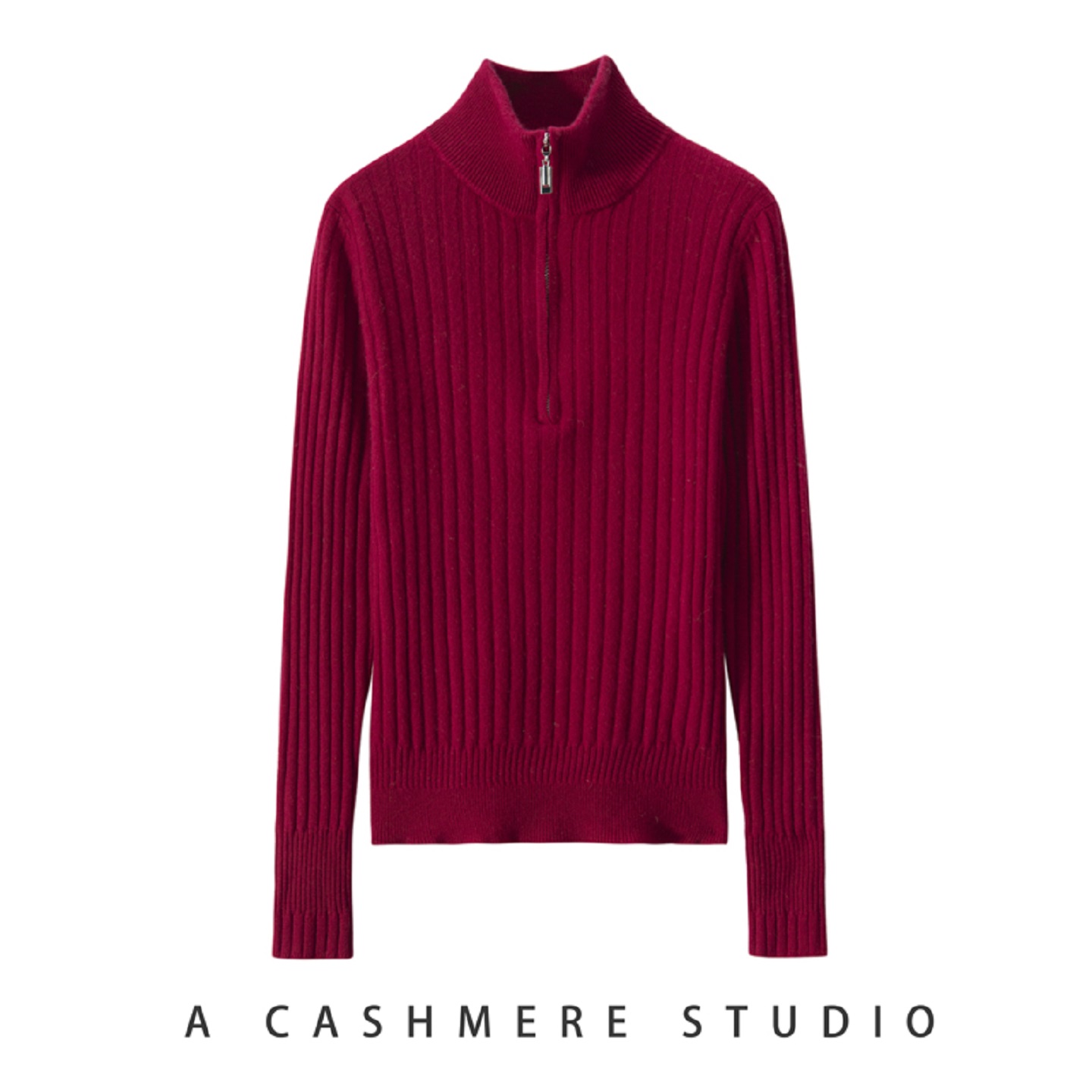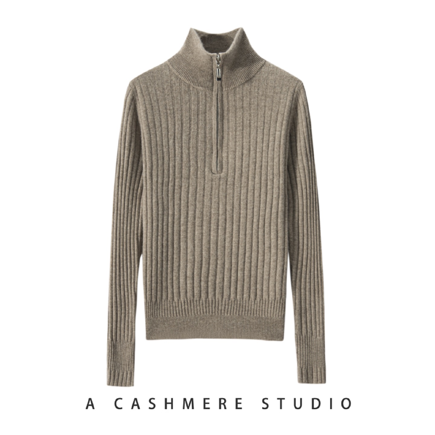 高领半拉链坑条羊绒衫女秋冬软糯亲肤保暖显瘦修身针织衫打底毛衣