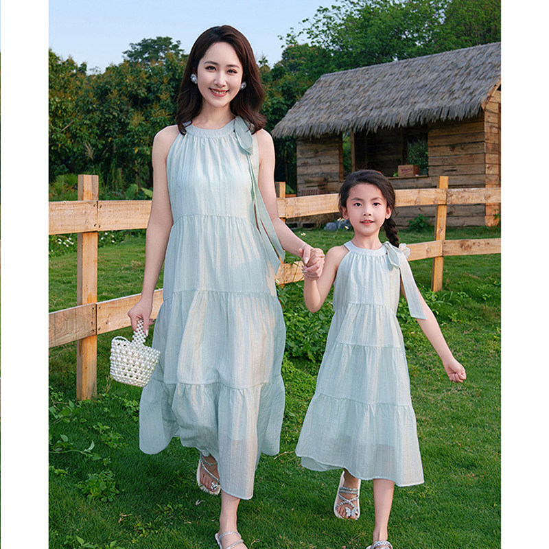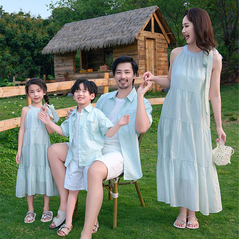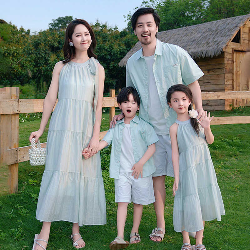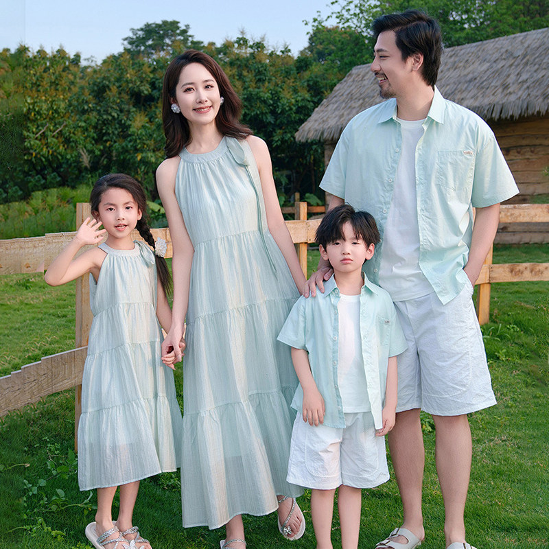 高端亲子装海边度假沙滩装2025新款一家三口四口旅游母女连衣裙