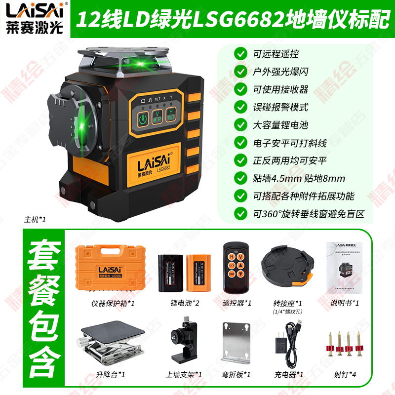 莱赛12线LD红绿光水平仪LSG6682贴地贴墙高精度电子调平爆闪锂电