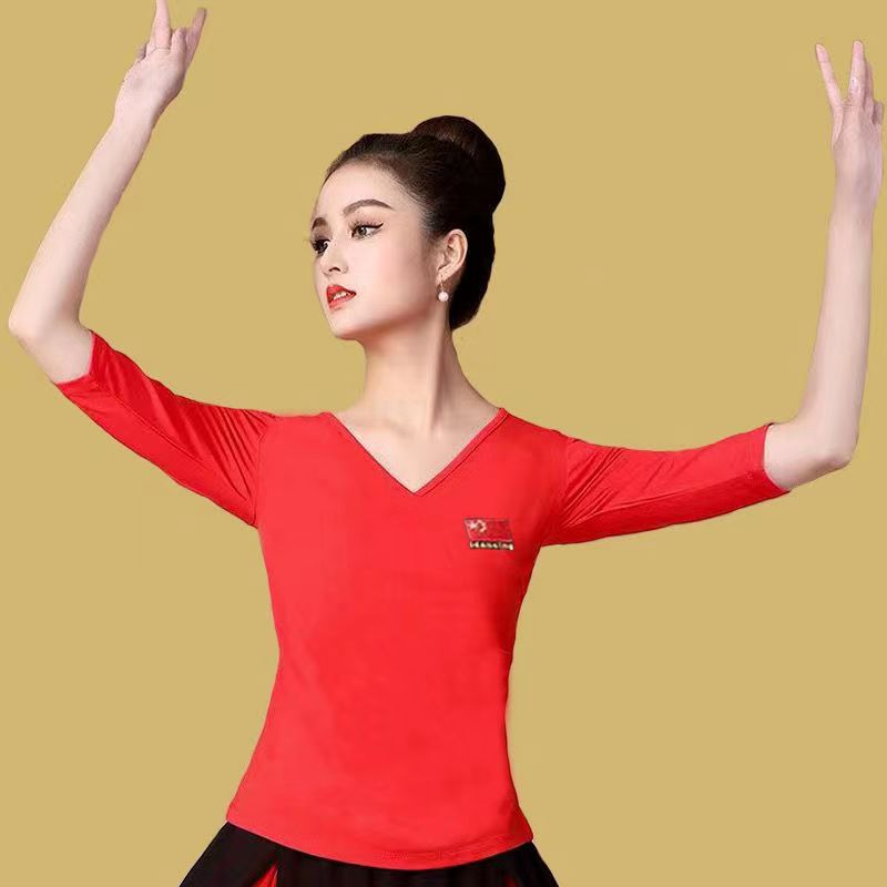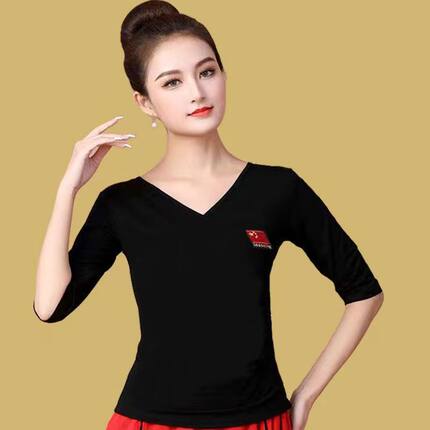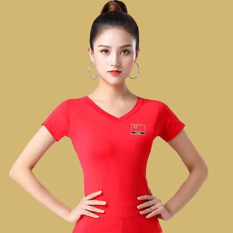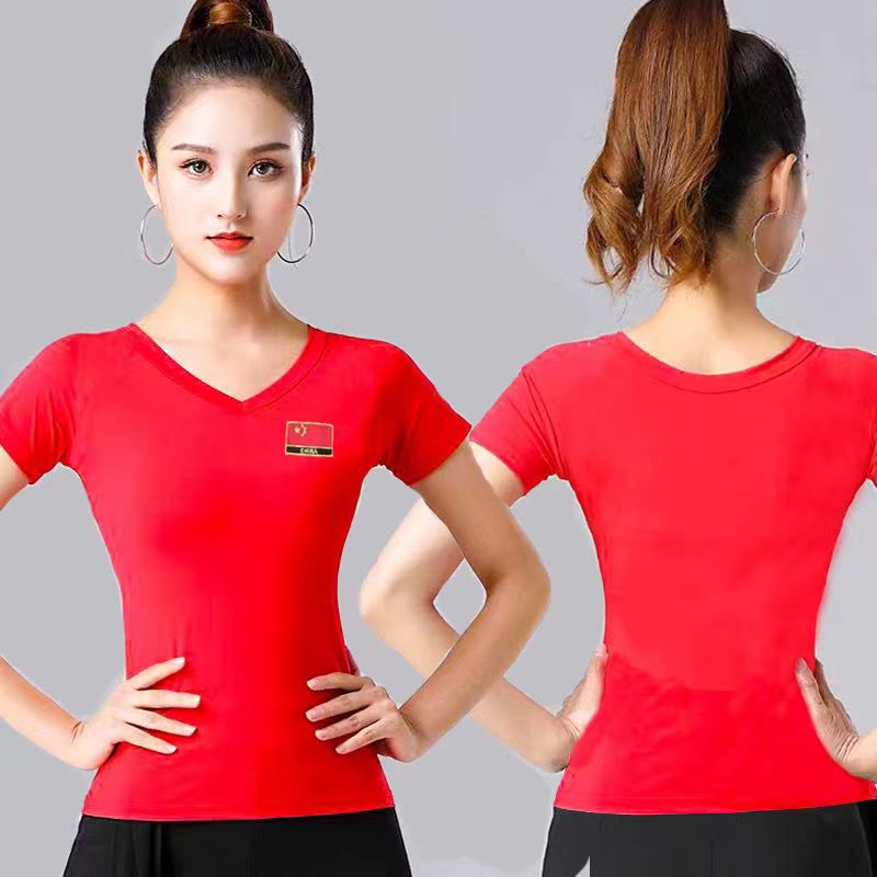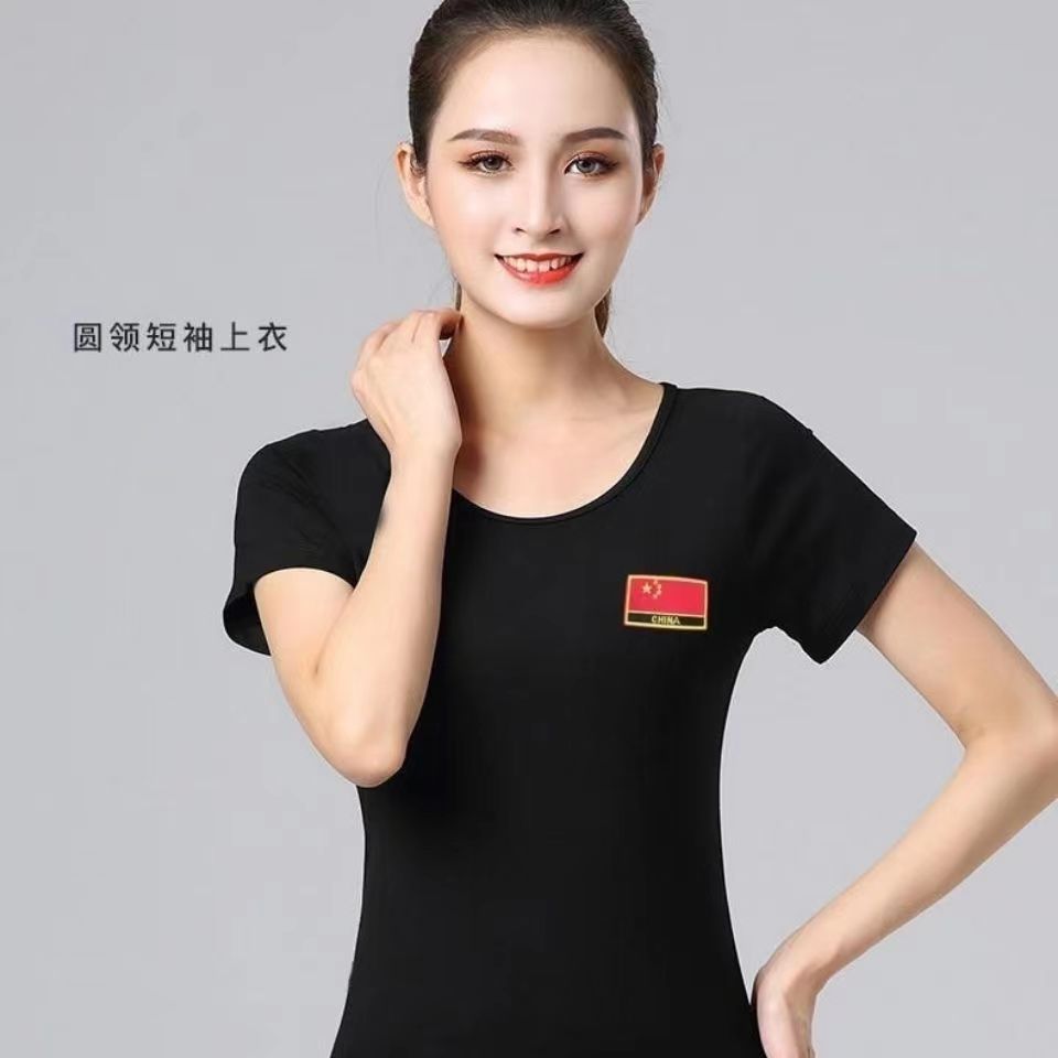 广场舞服装V领中袖上衣女夏莫代尔棉跳舞服装新款水兵国旗演出服