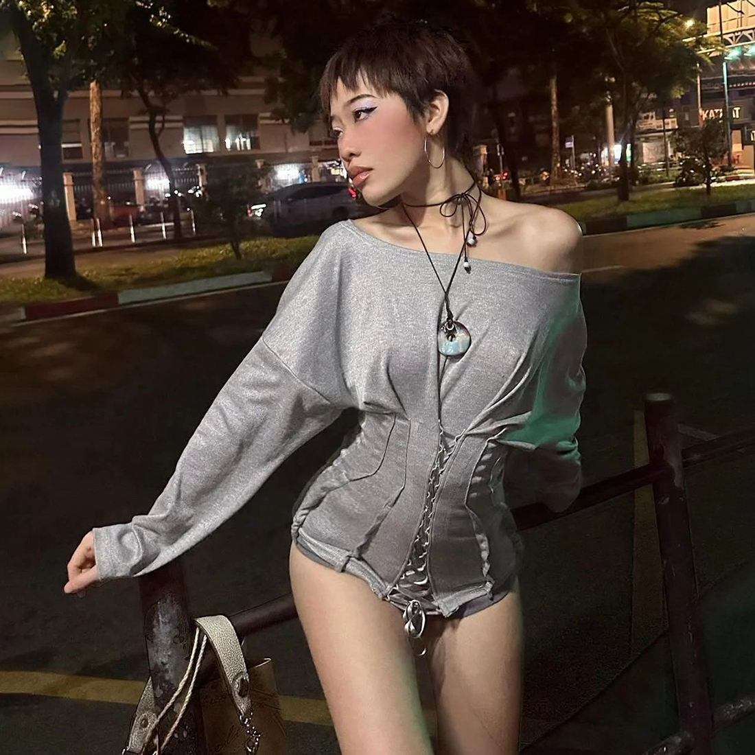 #Sisjuly#酷拽街头y2k小众辣妹装 收腰绑带设计纯色斜肩长袖T恤女