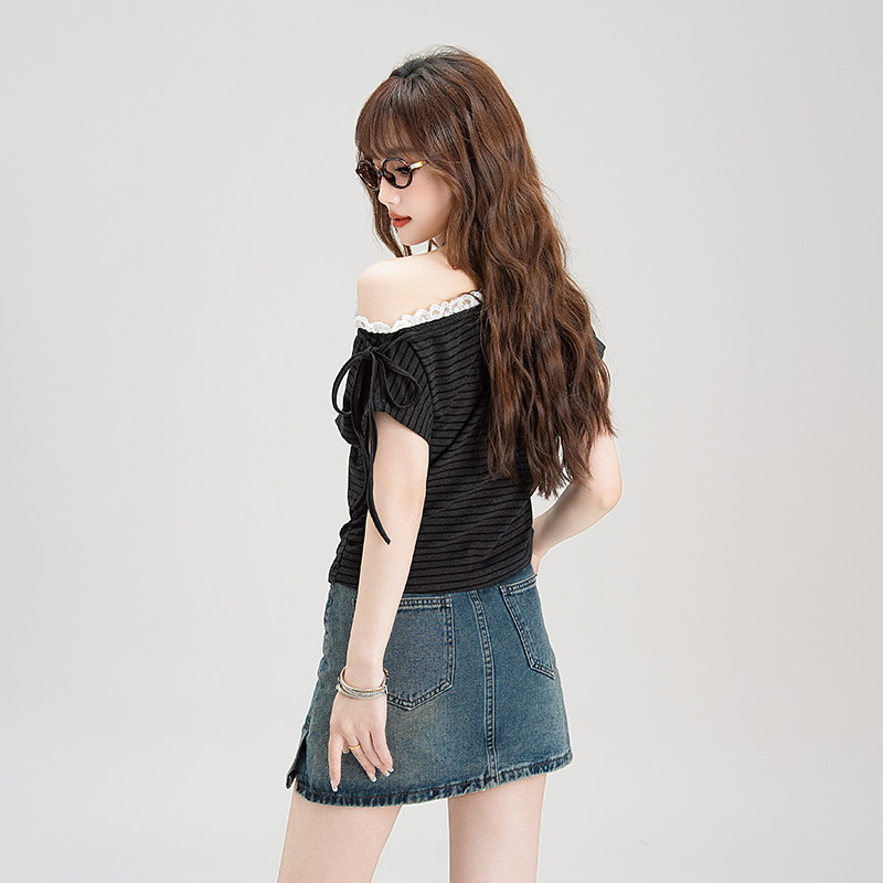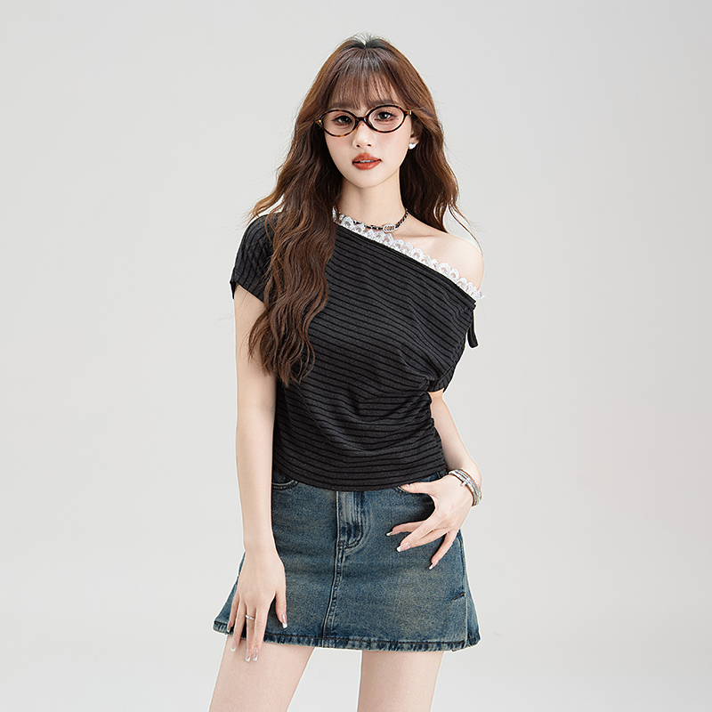 美式复古蕾丝花边短袖T恤女夏季新款抽绳设计修身显瘦百搭上衣潮