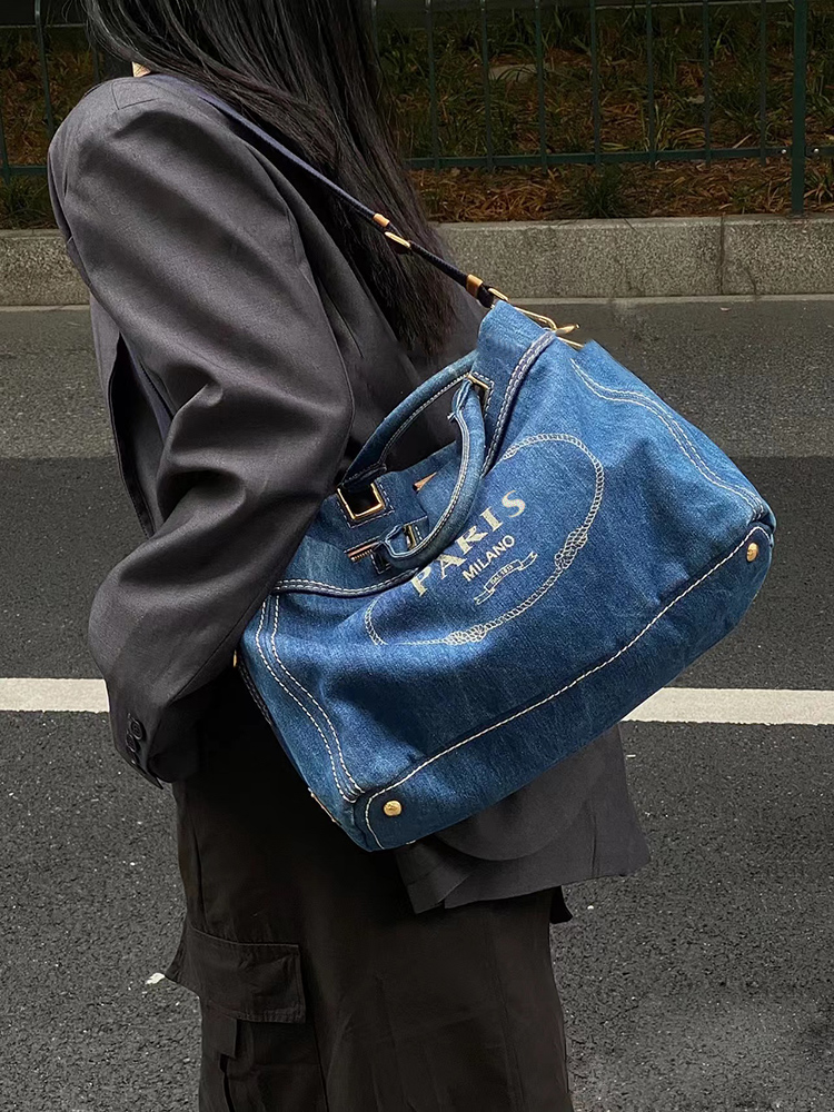网红同款复古百搭印花牛仔包单肩斜跨包包托特包2022新款潮
