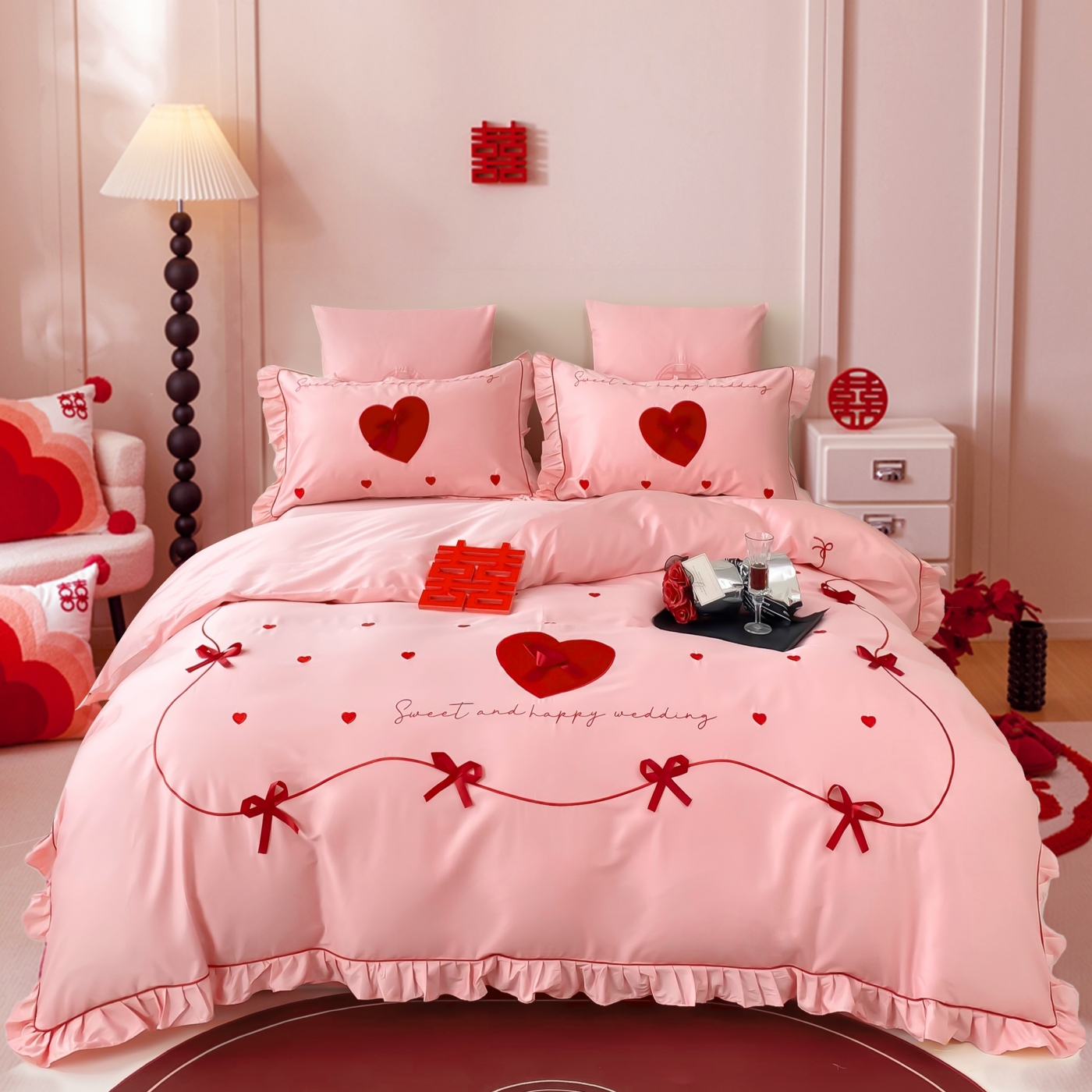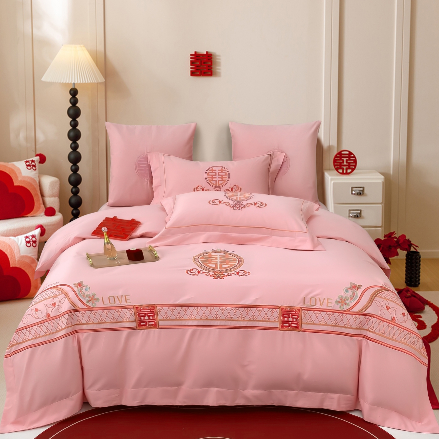 婚庆四件套全棉纯棉长绒棉新婚婚礼粉色刺绣结婚房喜庆床上用品4