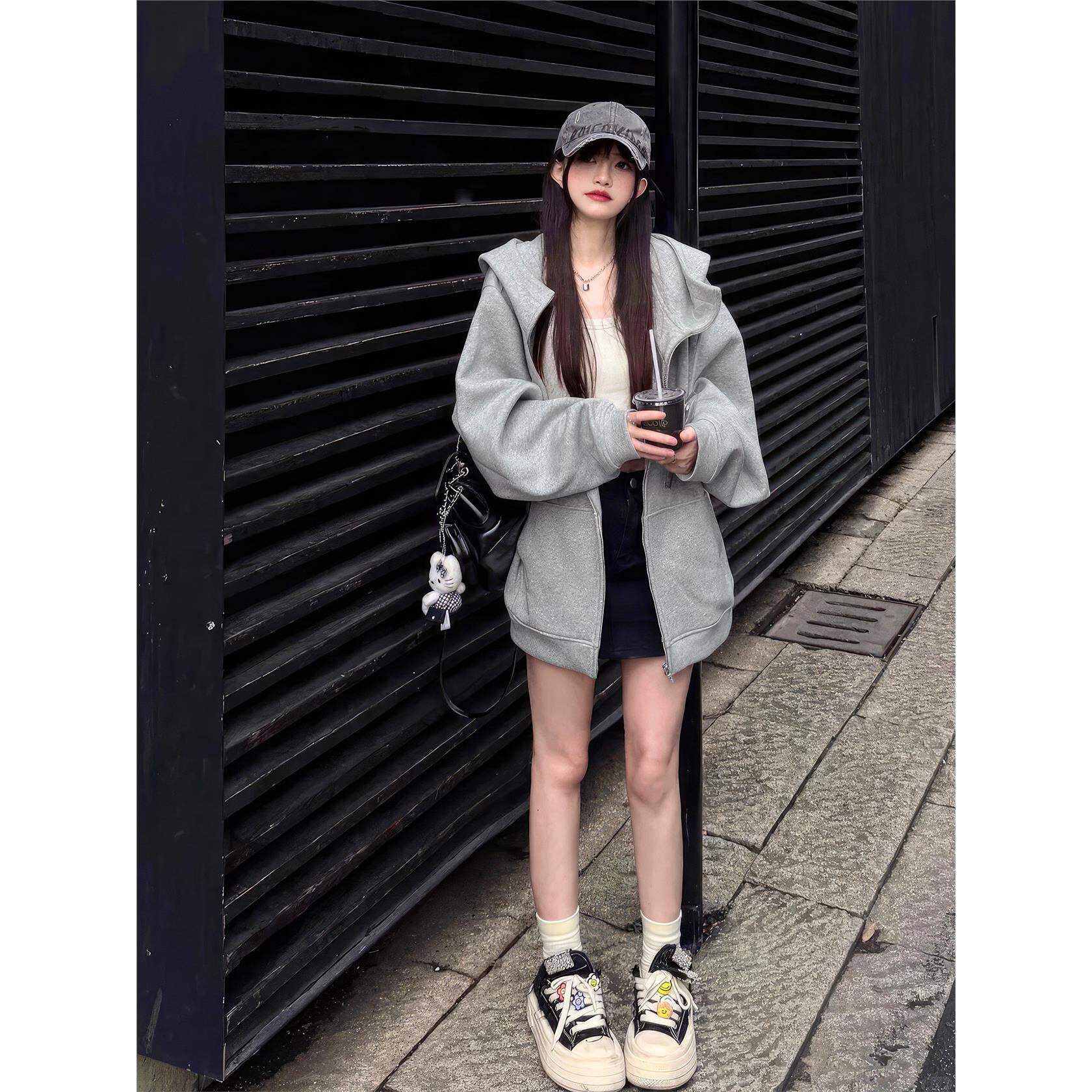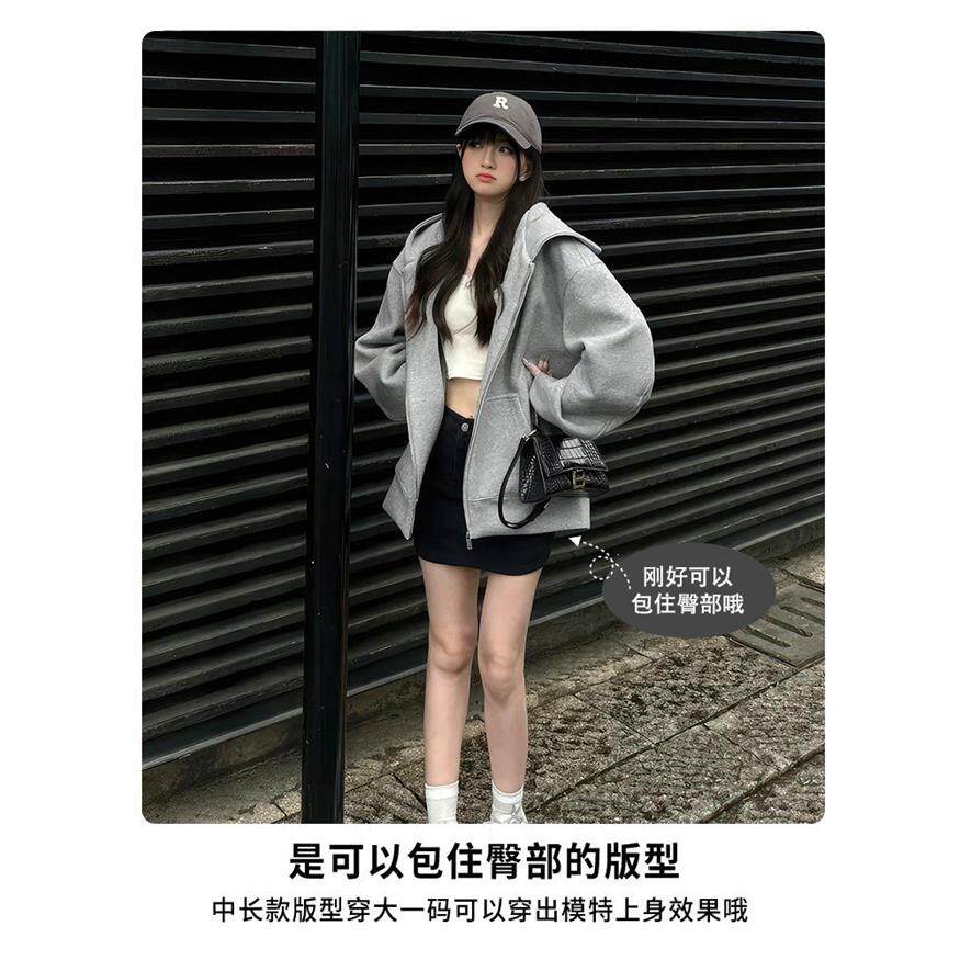 灰色卫衣女2025新款外套拉炼开衫爆款秋冬季连帽宽松加绒加厚上衣