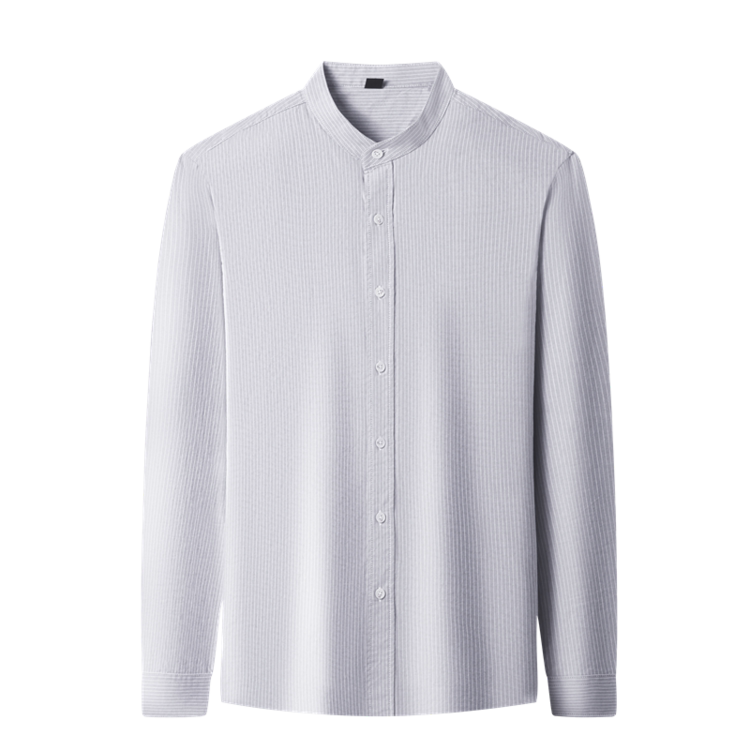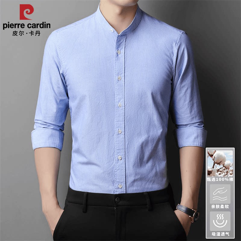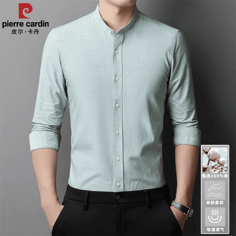 皮尔卡丹秋季新款纯棉长袖衬衫男士小立领打底衫休闲无领免烫衬衣