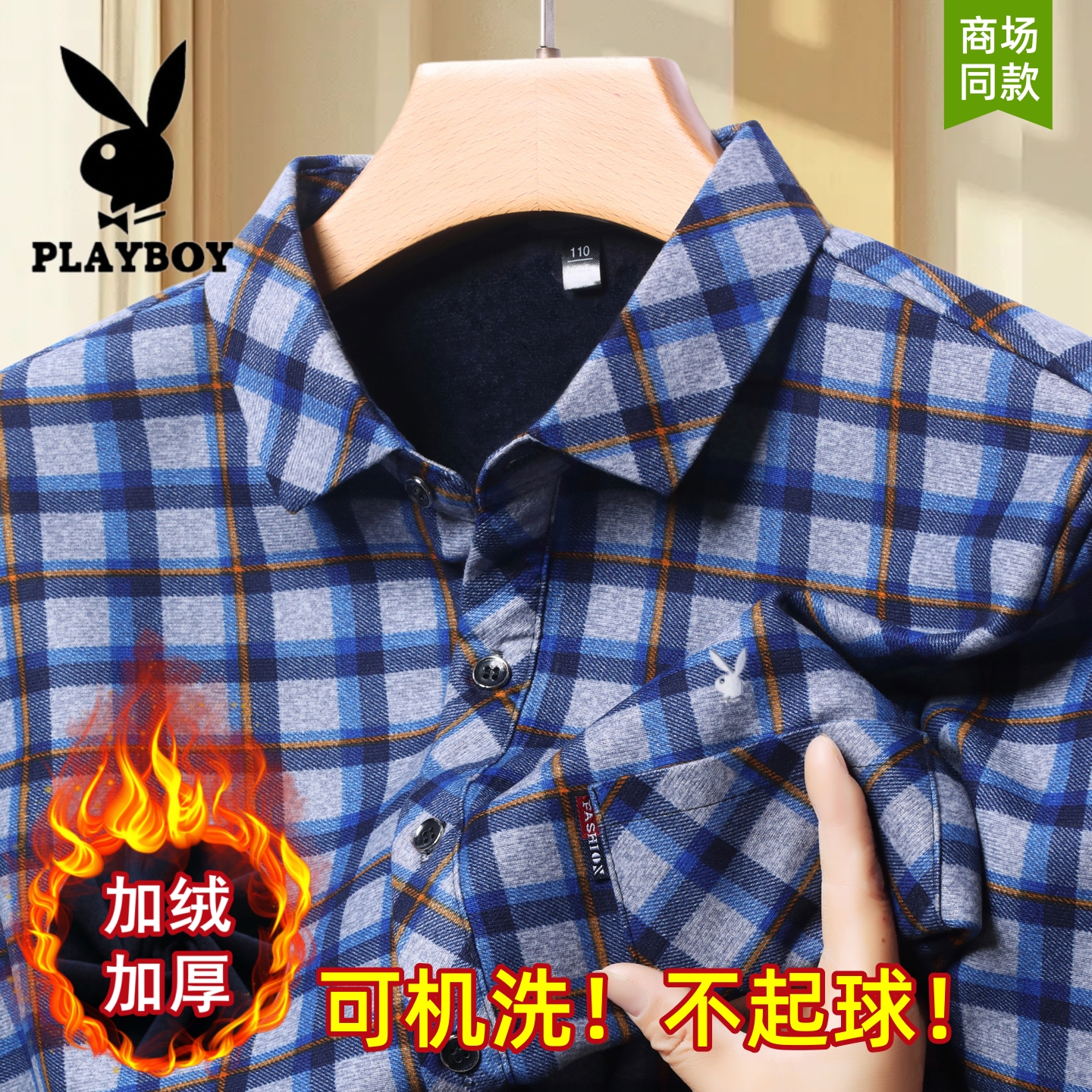 花花公子男士保暖衬衫中年爸爸冬装加绒加厚纯棉大码免烫老年衬衣