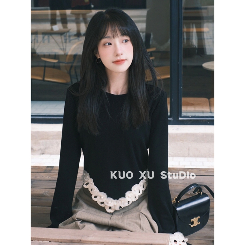秋冬穿搭气质修身显瘦珍珠花边长袖针织衫毛衣休闲阔腿裤套装女