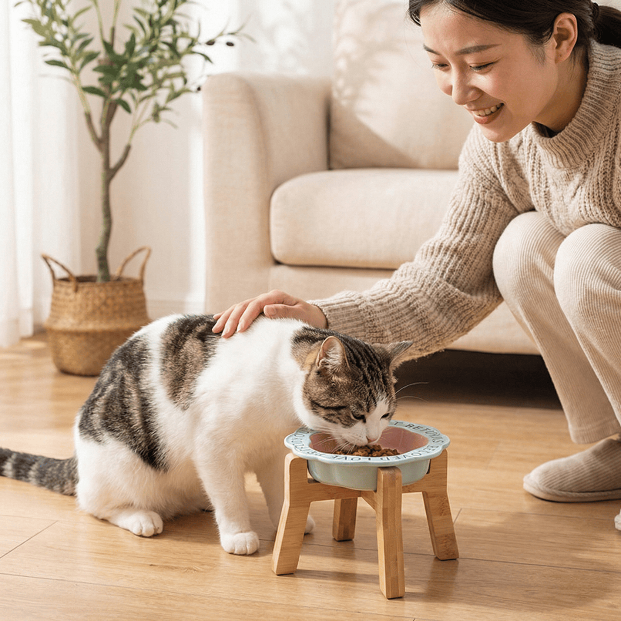 花边猫碗防黑下巴猫罐头食盆陶瓷狗粮碗猫咪防打翻喂水碗高脚木架