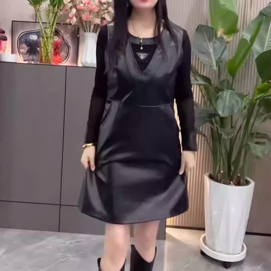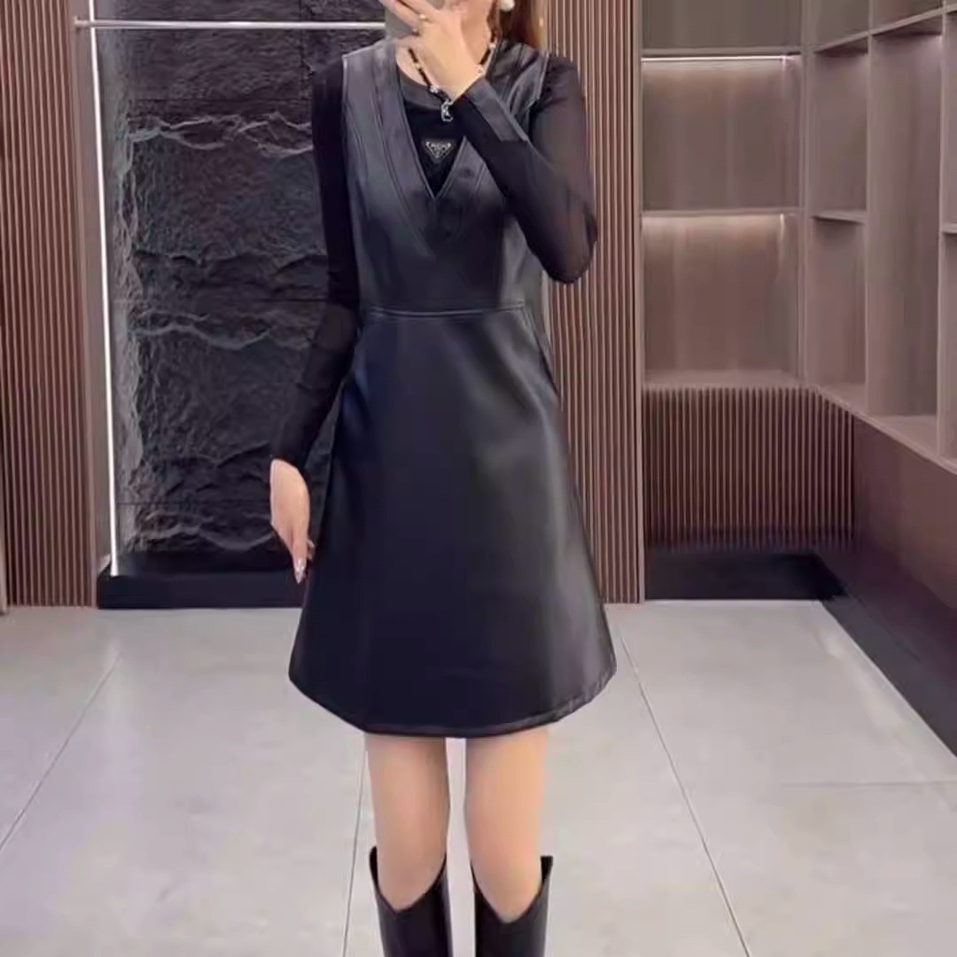 美拉德风PU皮无袖连衣裙女黑色