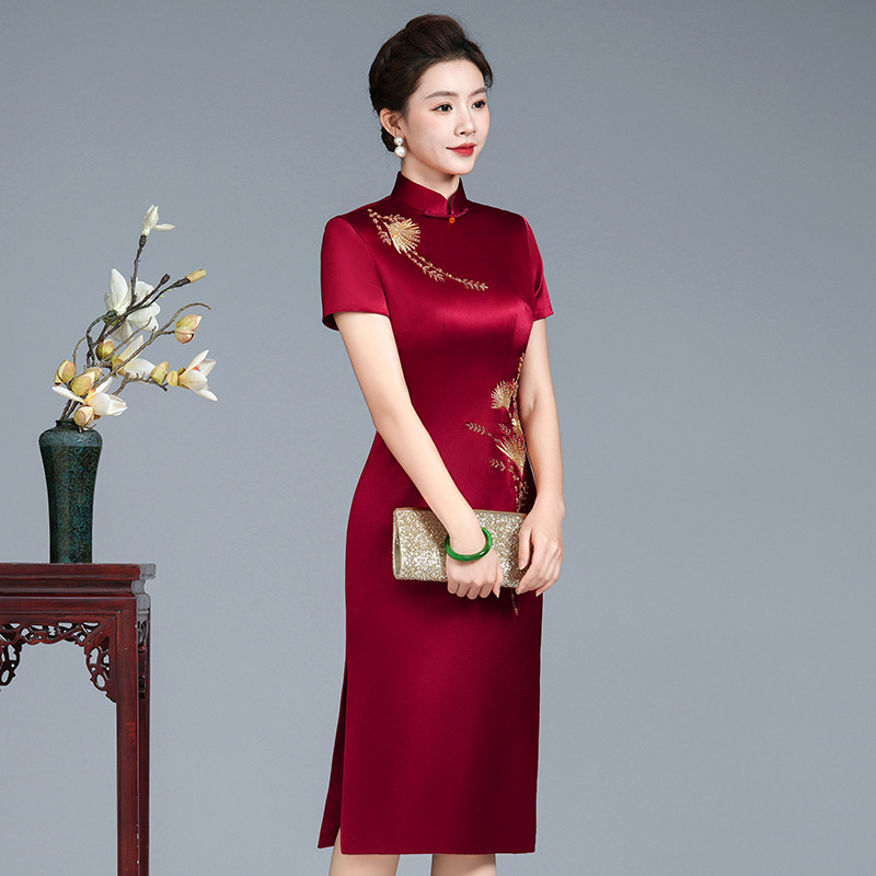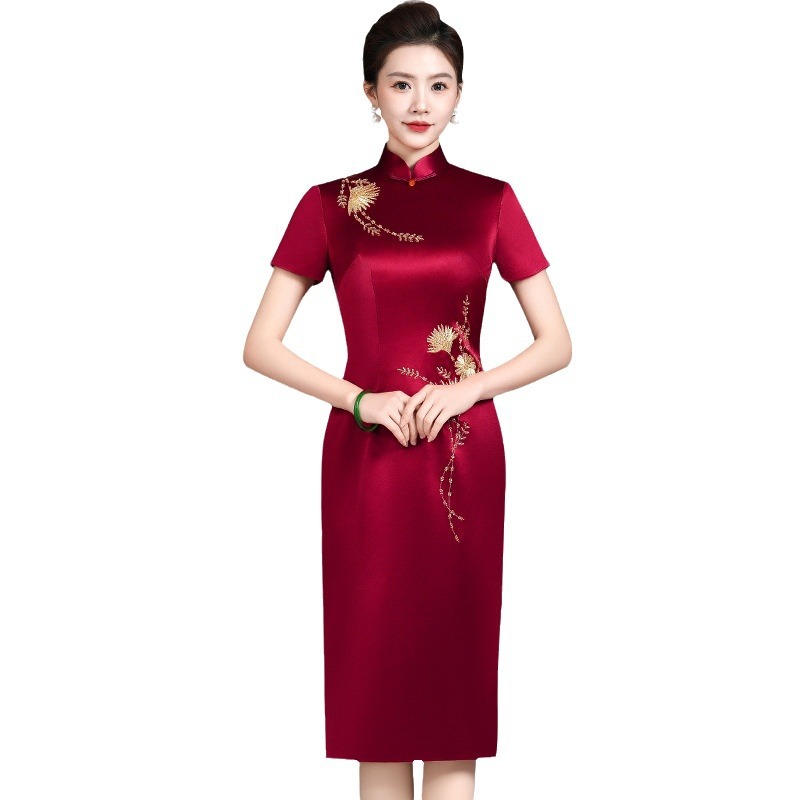丈母娘婚礼服高贵喜婆婆婚宴装新款高端旗袍醋酸结婚妈妈礼服短袖