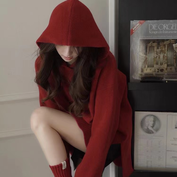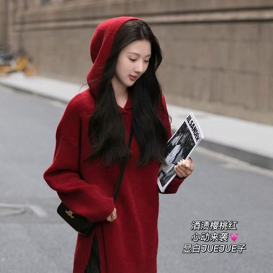 本命年新年红色连帽中长款毛衣女秋冬慵懒风宽松时尚高级感针织衫