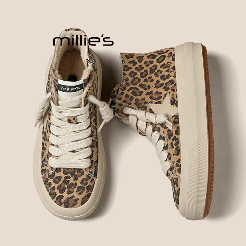MILLIE'S/妙丽豹纹高帮老爹鞋女加绒保暖厚底板鞋侧拉链棉鞋Z