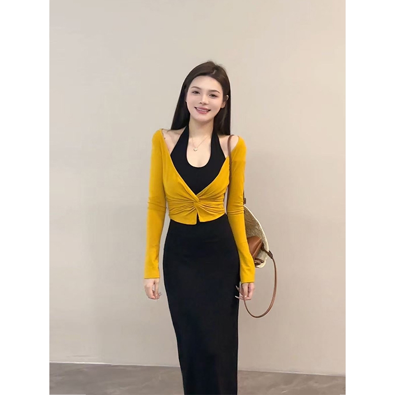 苏苏 早秋新款扭结设计上衣款挂脖连衣裙撞色拼接长裙DT1108