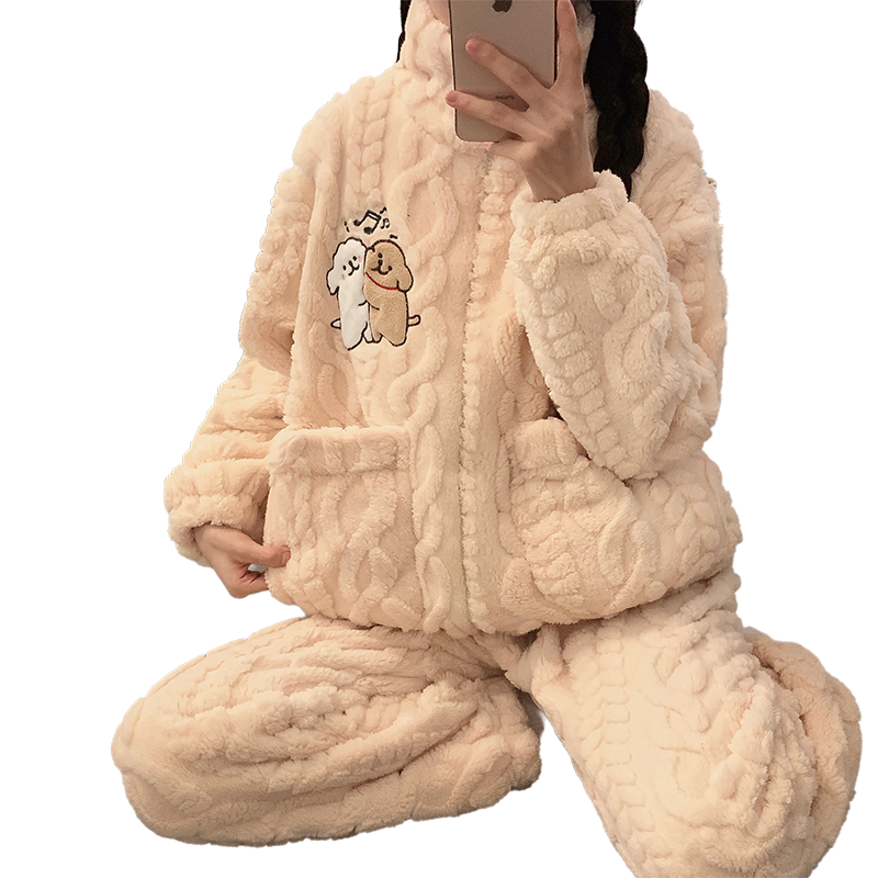 猫人珊瑚绒睡衣女秋冬季加绒加厚保暖套装可外穿甜美法兰绒家居服
