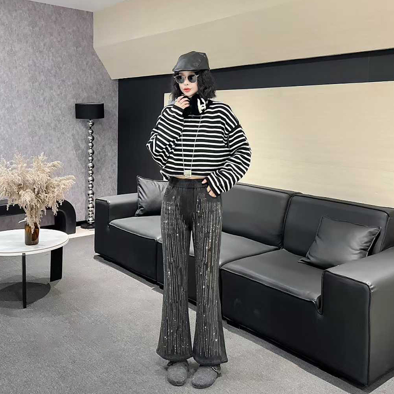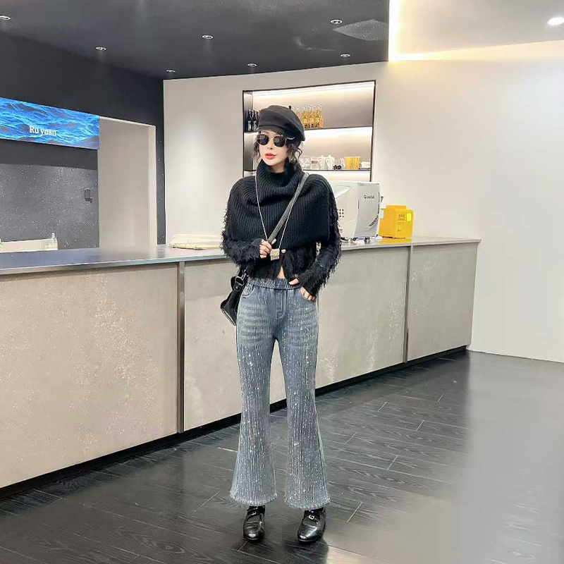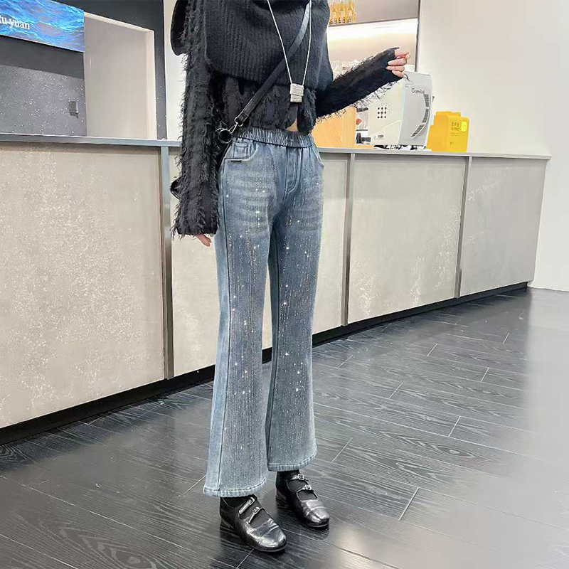 加肥松紧腰亮钻加绒裤子大码女装设计感欧洲站洋气百搭九分牛仔裤