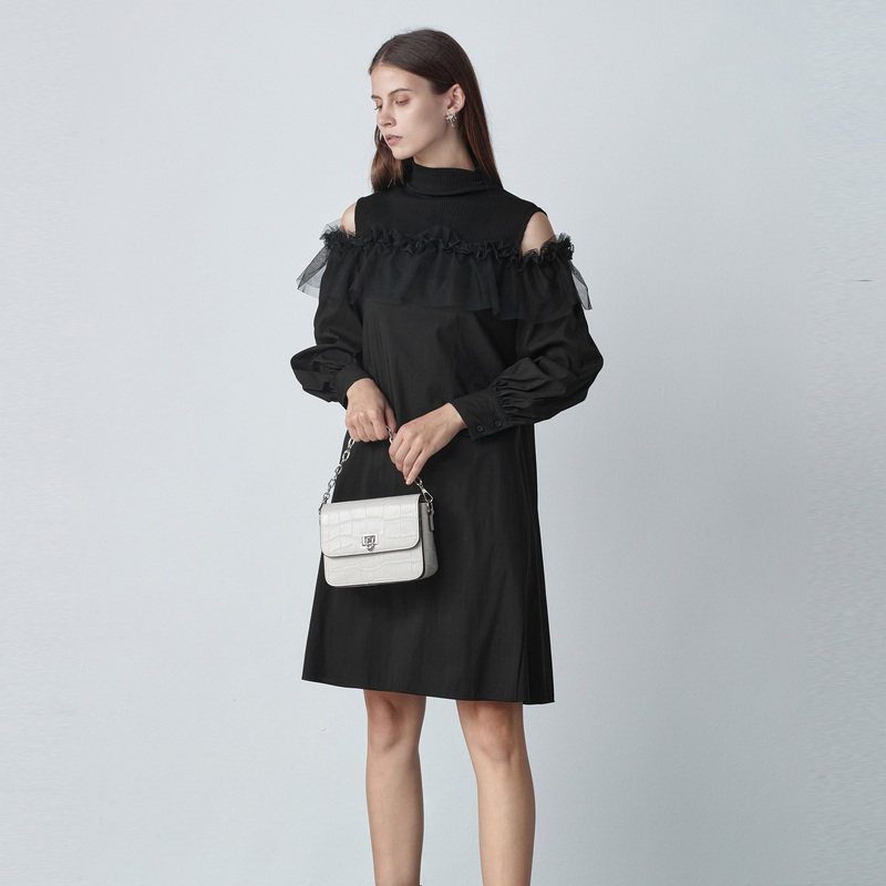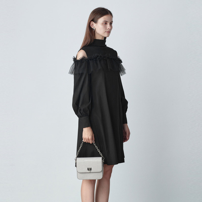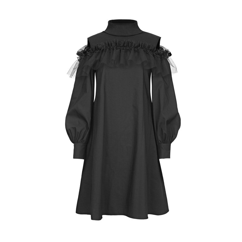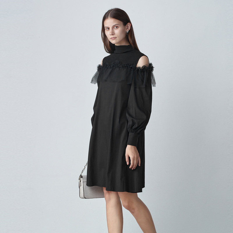 sdeer圣迪奥女春装半高领露肩蕾丝网纱拼接连衣裙S221Z1262